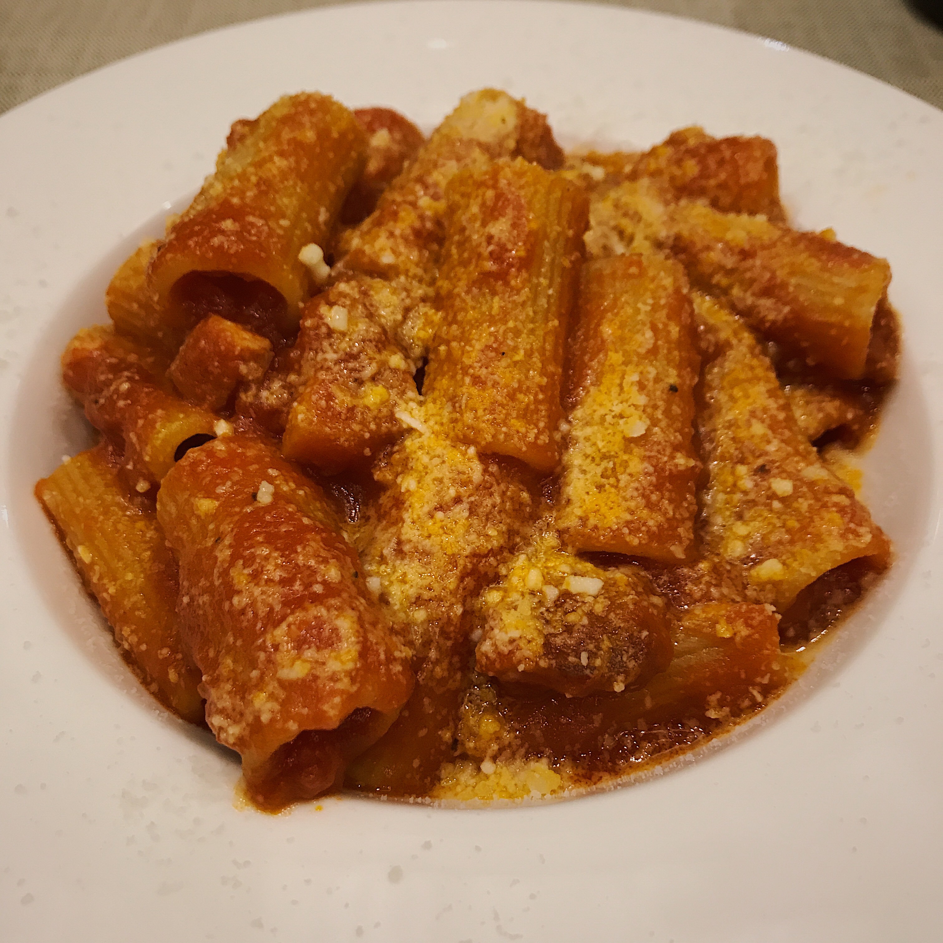 Rigatoni all’amatriciana is as simple and rustic as it should be. The best pasta dishes, like the best pizzas, often only use one or two ingredients, but maximise the flavour of those ingredients. Here, Italian tomatoes are the star: slightly sweet and reduced to a thick sauce that coats the fat rigatoni. Chunks of crispy pancetta hide underneath.