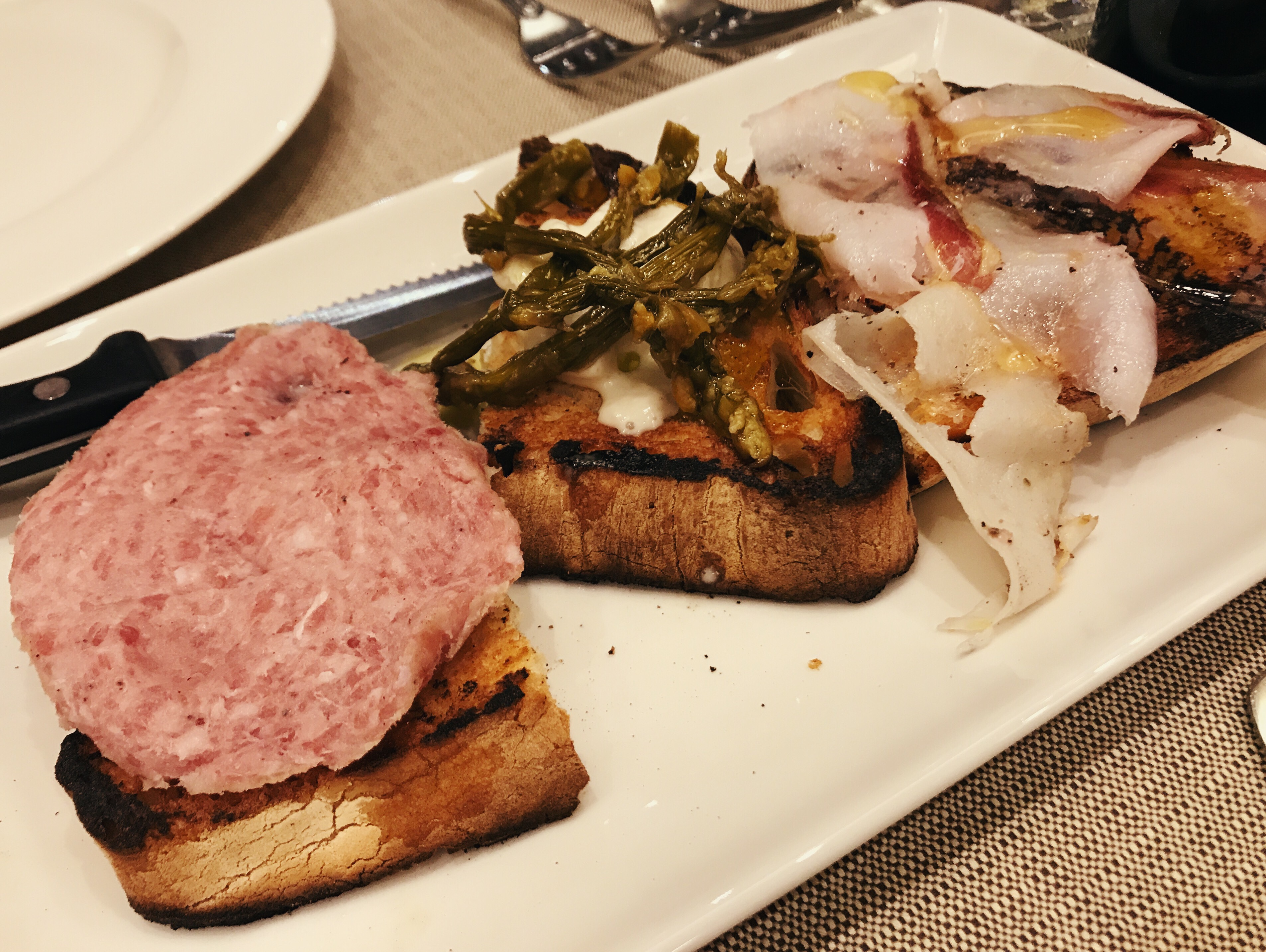 We finally make it to our destination, a lovely family-run place with wood-burning ovens as you enter and a real Italian mamma behind the counter. First up, a trio of bruschette: ciauscolo (a kind of soft sausage smoked over juniper branches), asparagus draped over soft cheese, and lardo brushed with honey. The thick slices of bread have a satisfying home-baked crunch.