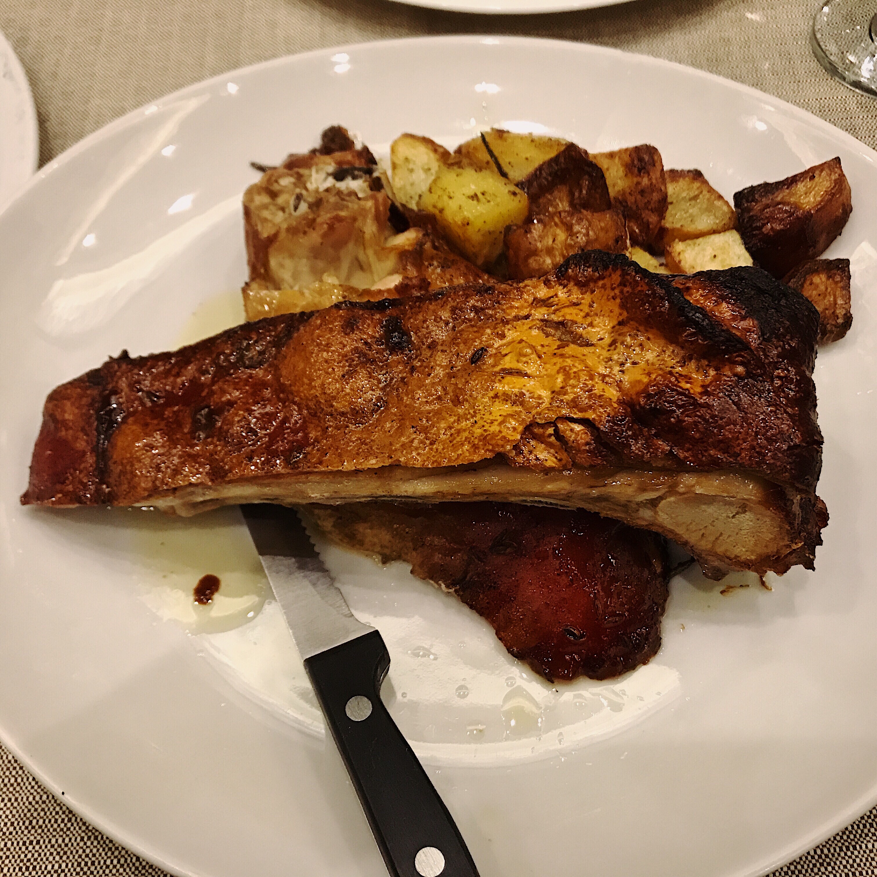Finally, for secondi, we choose one of the house specialties: roasted maialino (suckling pig) with a heap of herby, salty potatoes. Two cuts arrive – ribs and a sliver of shoulder (I think) – both topped with a burnished layer of crackling. Not a green vegetable in sight, but it doesn’t matter. The pork is juicy and tastes of smoky woodiness from the ovens at the front of La Tavernaccia.