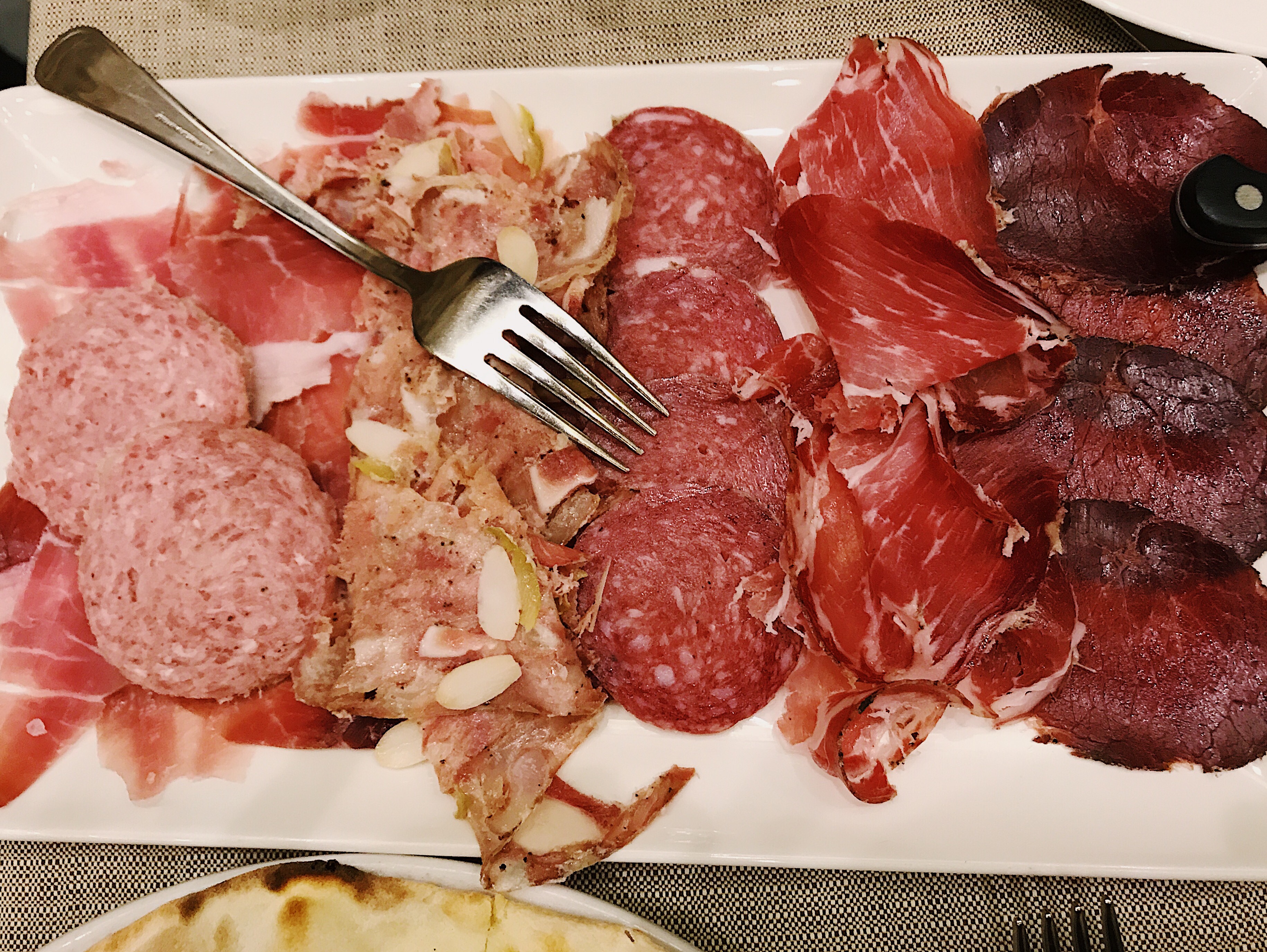 Next, a full plate of salumi: prosciutto, bresaola, ciauscolo (again) and various others I couldn’t name. The highlight is a pâté-like sausage flecked with almonds. The table next to us also has a cheese plate, which we eye with envy.
