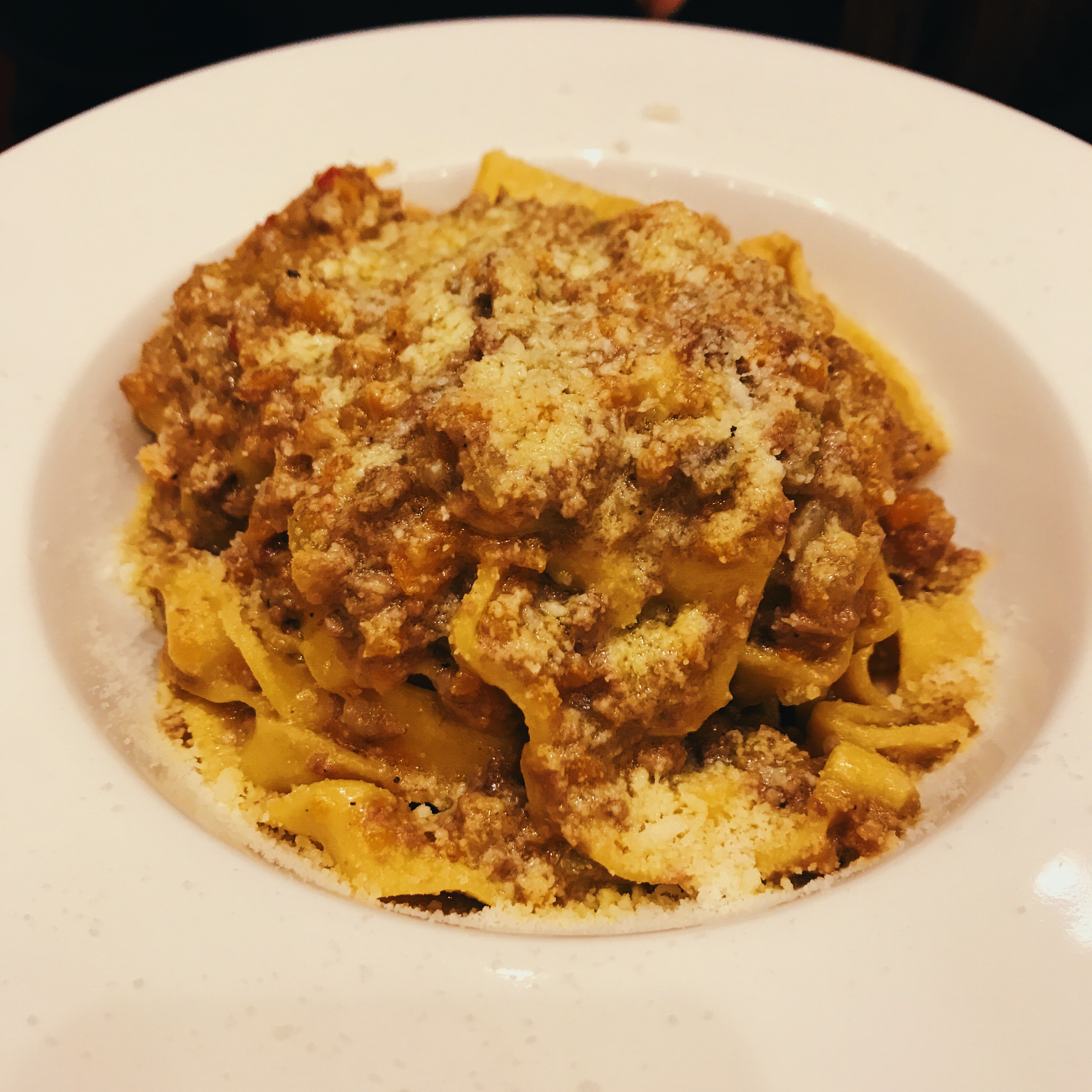 Pappardelle al cinghiale is even better. The wild boar ragù is rich and hearty and sticks to the thick pappardelle – a name which comes from an Italian verb meaning “to gobble up”. We do just that.