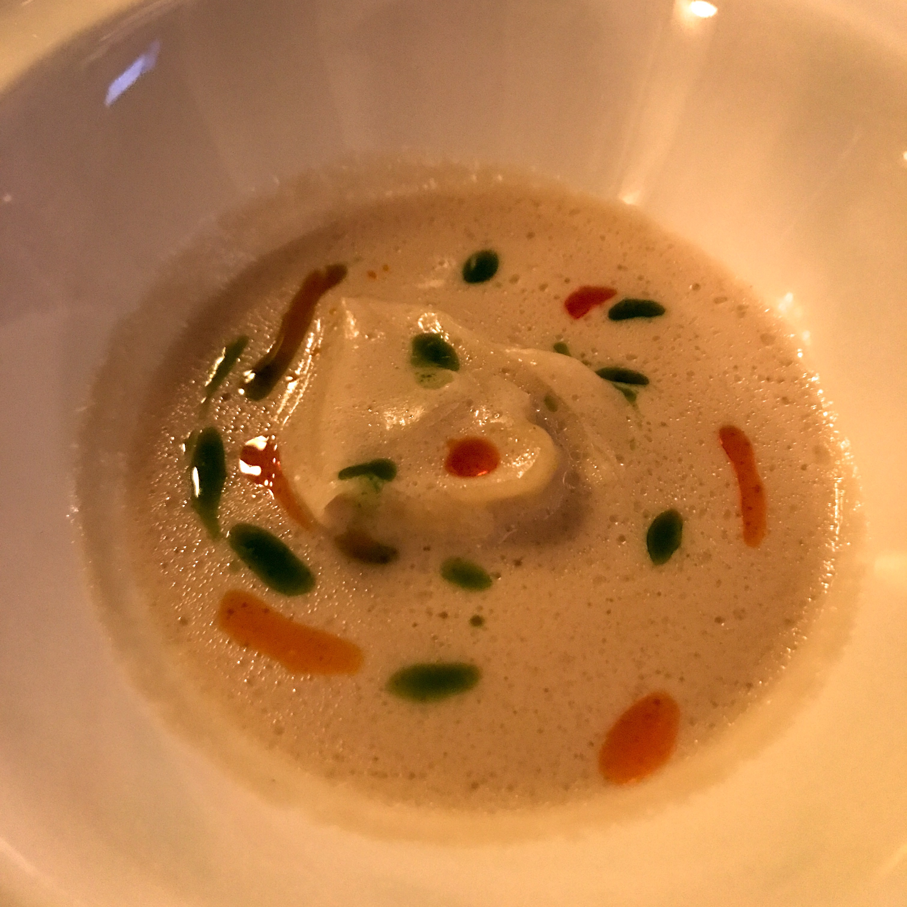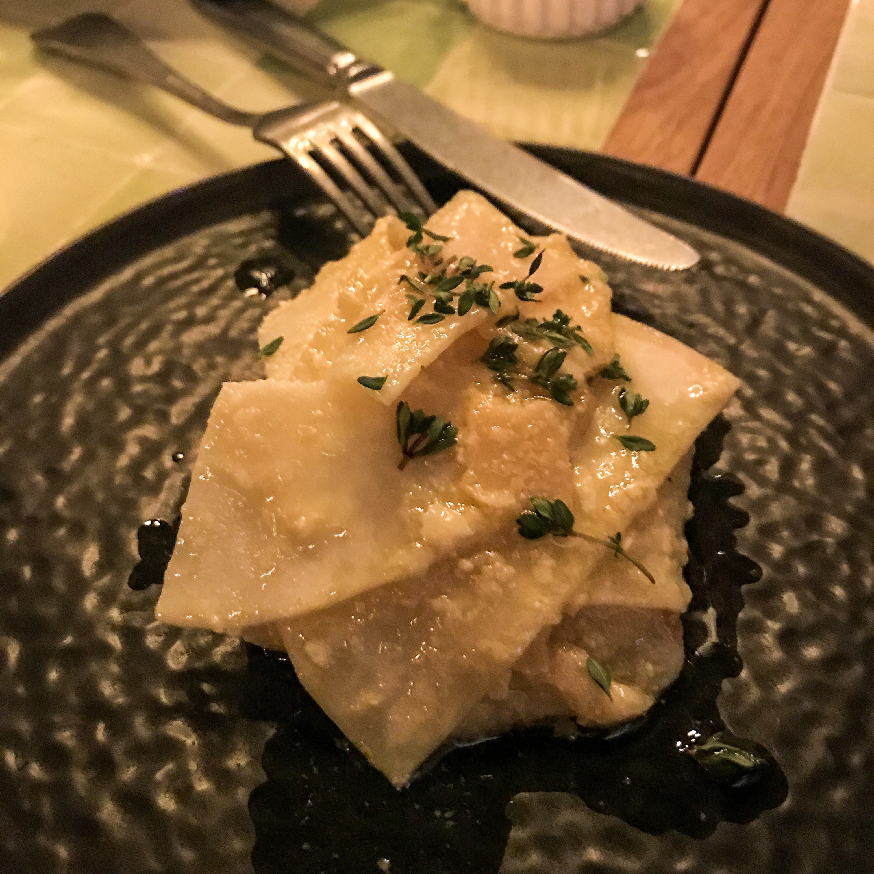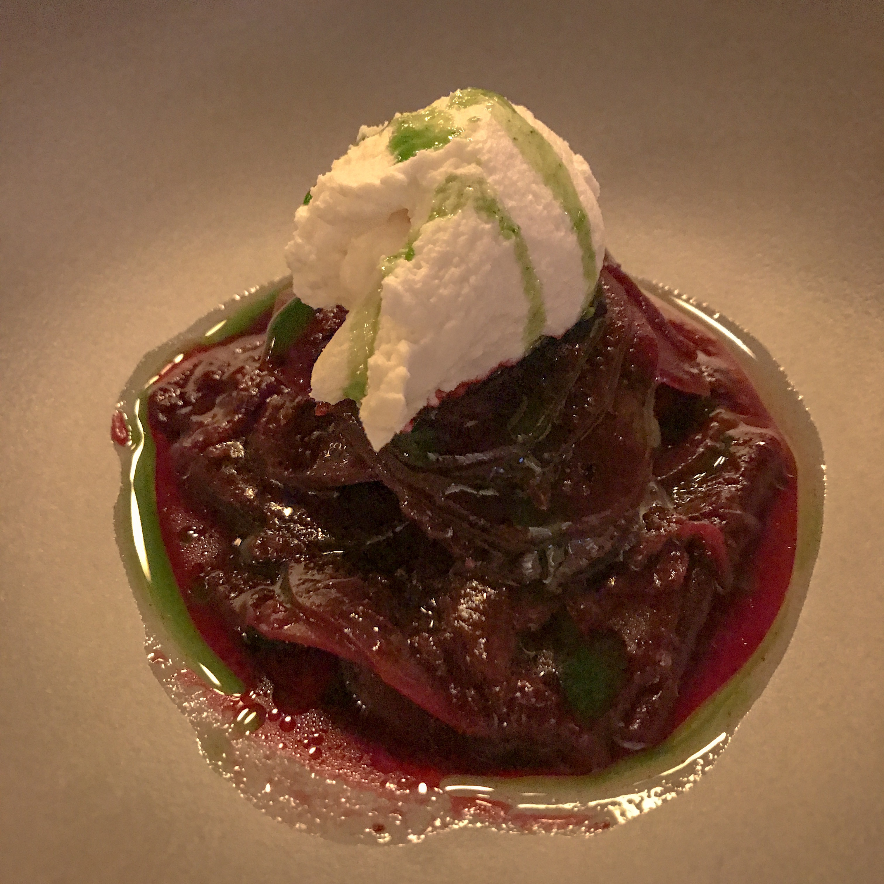 Thick slices of celeriac, braised in olive oil, are piled high and sprinkled with lemon thyme leaves. The pasta-like slices are firm and nutty and there is a hint of quince somewhere in there that subdues any extra oiliness. Our first wine – a 2016 Naked Truth Savatiano vin jaune from Greece – initially has a strong, yeasty aroma but mellows after a little rest into something quite drinkable.