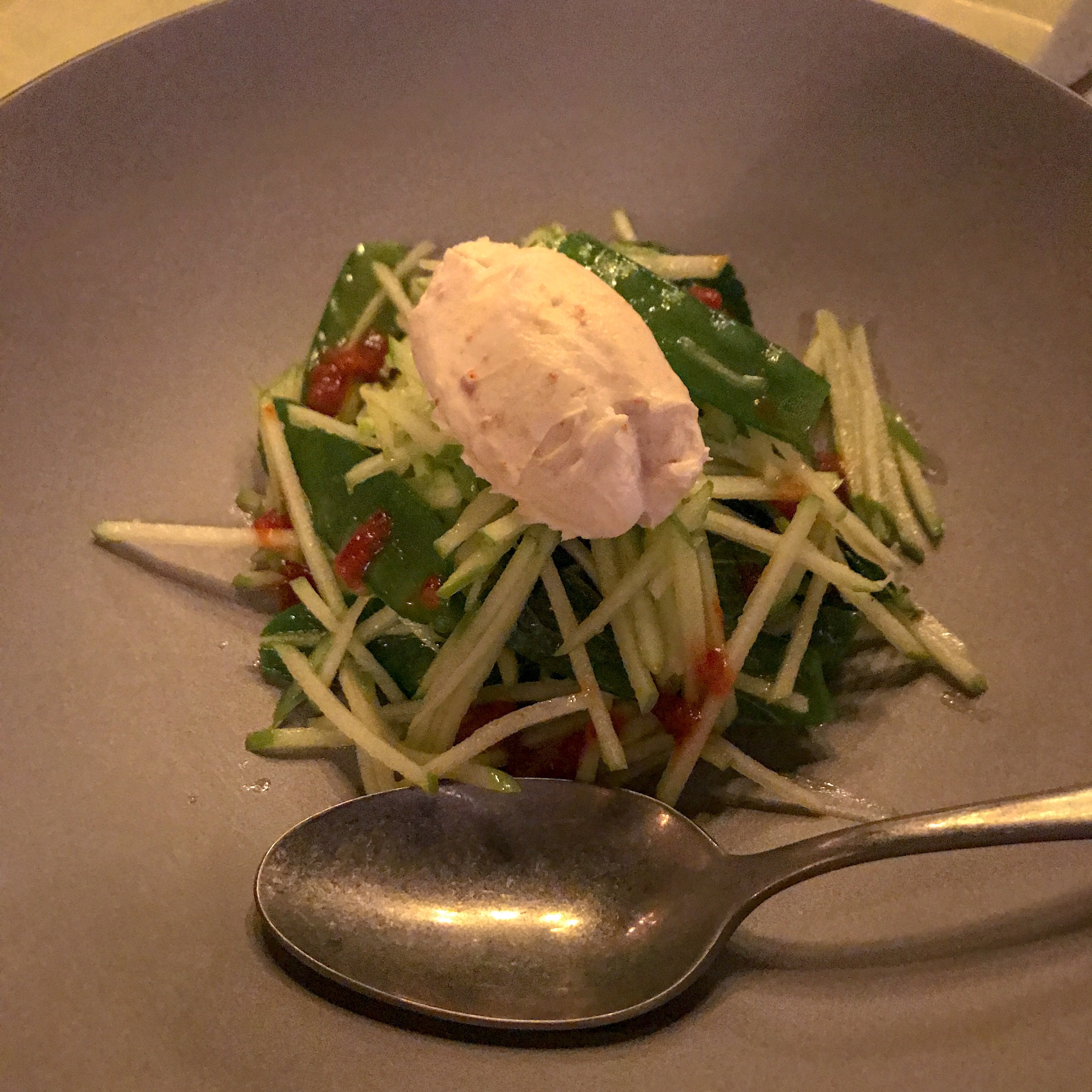Snow peas win the race out of the kitchen and arrive on our table first. They are mixed into a fresh salad of julienned green apple, chopped mint leaves, all topped with a thick dollop of chilli-infused yoghurt. Tart apple and a warm heat wake up our tastebuds for the dishes to come.