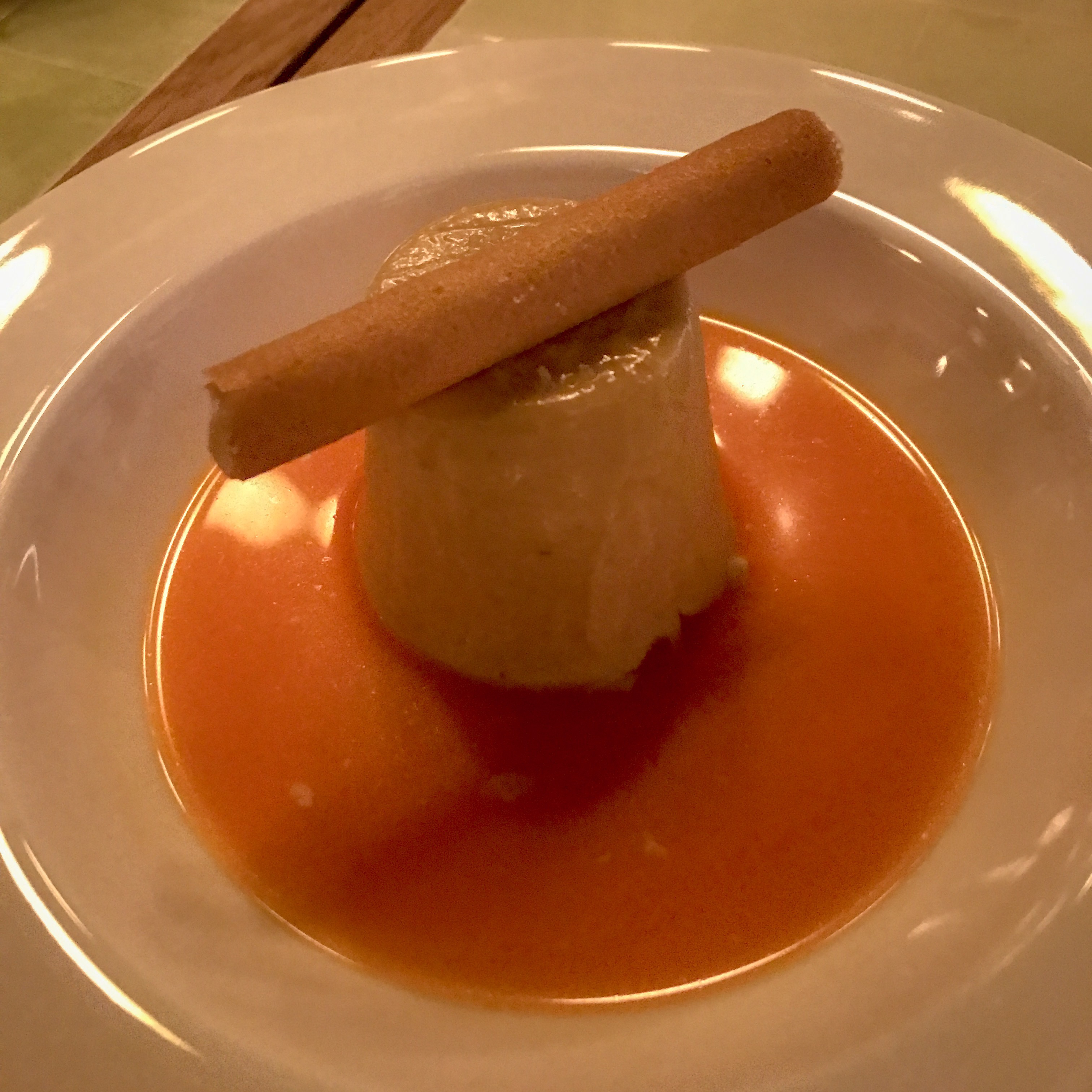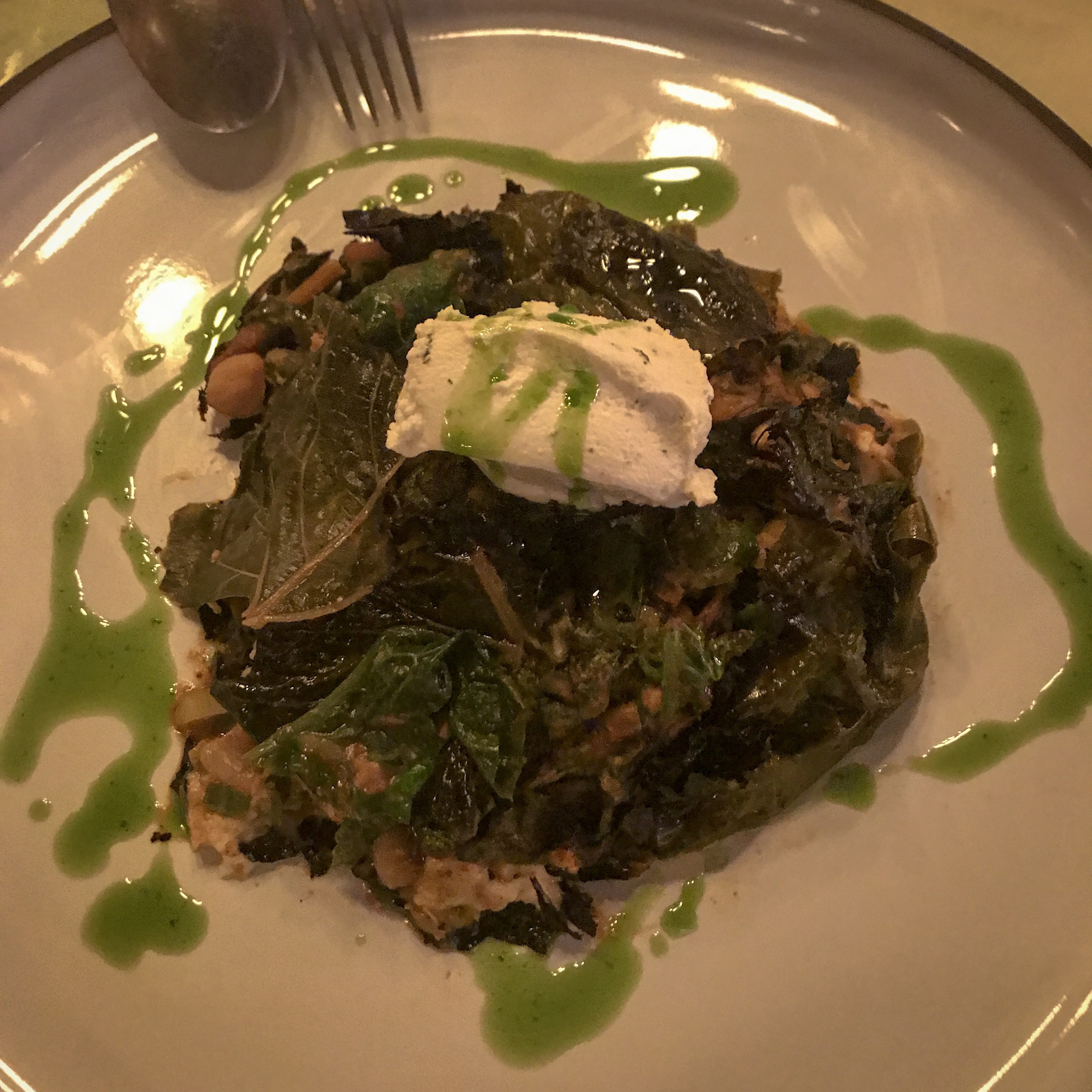 The roasted vine leaves are not served in the traditional stuffed rolls, but in a kind of rough medley with chickpeas, spinach, celery, mint leaves and another kind of soft cheese. Somehow it works – big forkfuls are quite satisfying and go well with a light, plummy 2014 Andreas Bender Pinot Noir from Germany.
