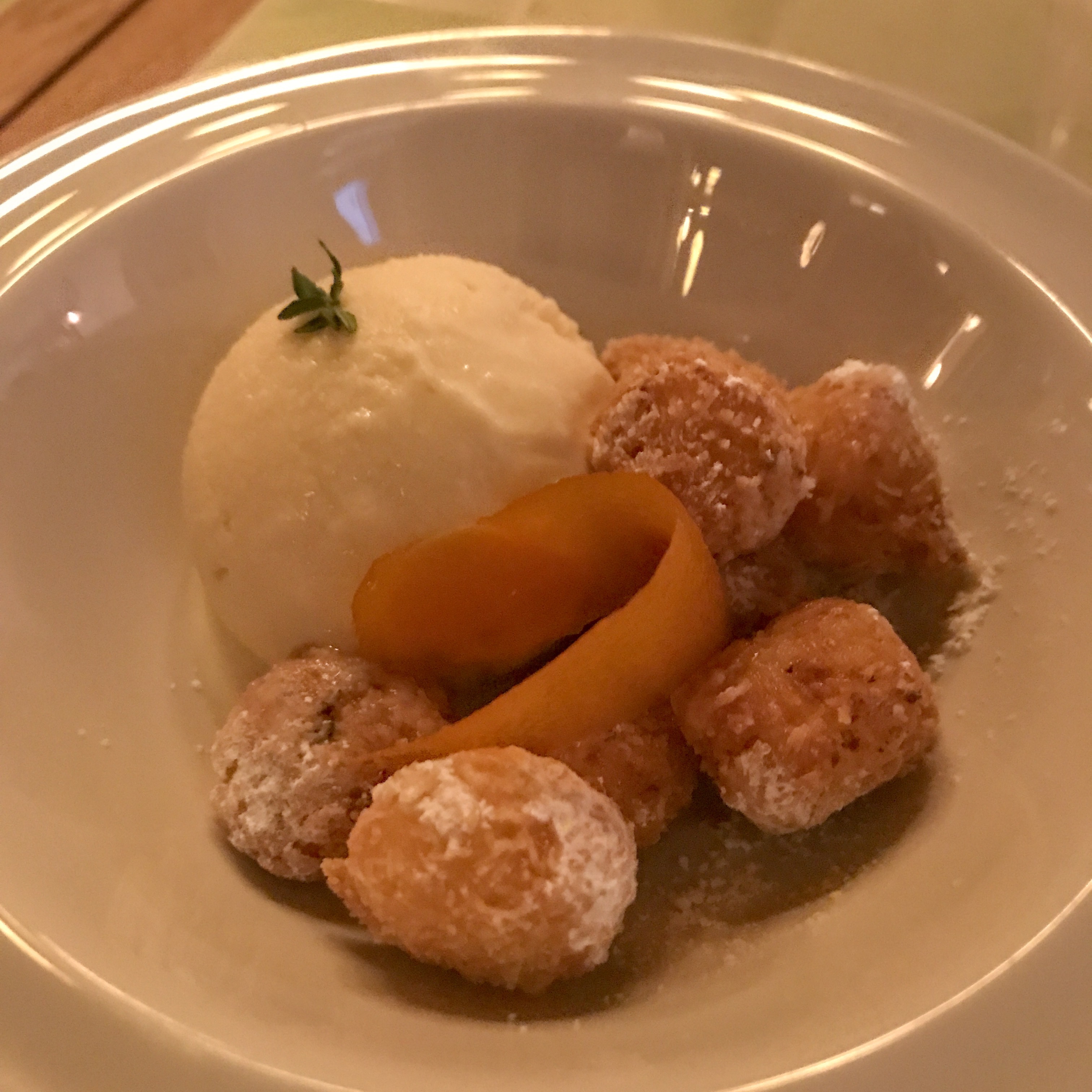 We order two desserts to finish: custard fritters with a mastiha ice cream and a caramel panna cotta with pumpkin jus. Mastic (also known as “tears of Chios“) is a plant resin extracted from trees on that island and is commonly used to make a natural gum or the Greek liqueur, mastiha. It gives the ice cream a thick, slightly chewy consistency and pine flavour. The fritters are a little small, but good for dunking into the ice cream. I was a little tipsy by this point, so didn’t pay much attention to the panna cotta, but was rather hoping for baklava or another pistachio-themed dessert to be on the menu.