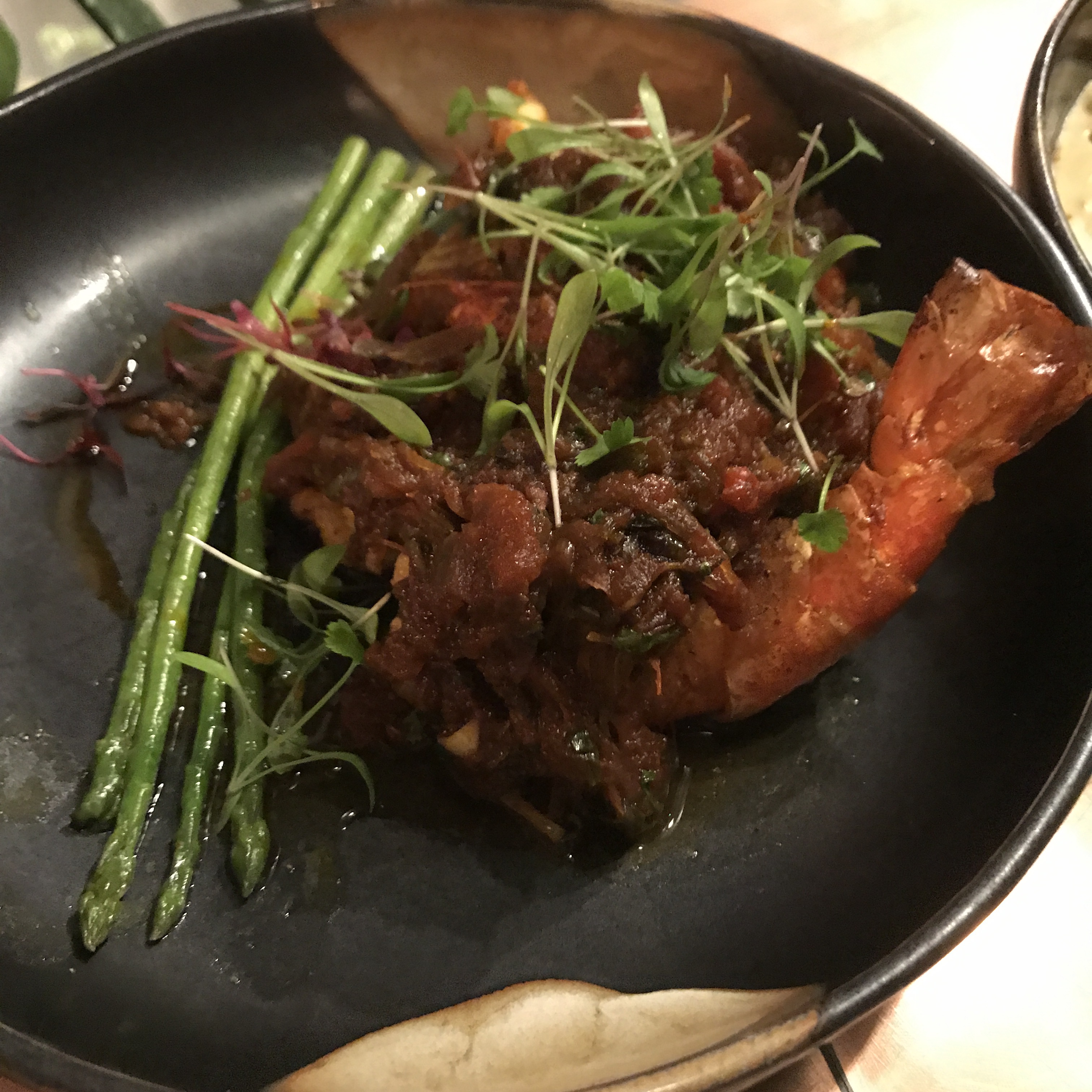 Two particularly plump crustaceans arrive in the king prawn curry (bazun hin), but, despite their size, they are quite tough and lack depth of flavour. We were also not particularly fussed by the asparagus spears, which are thin and limp.