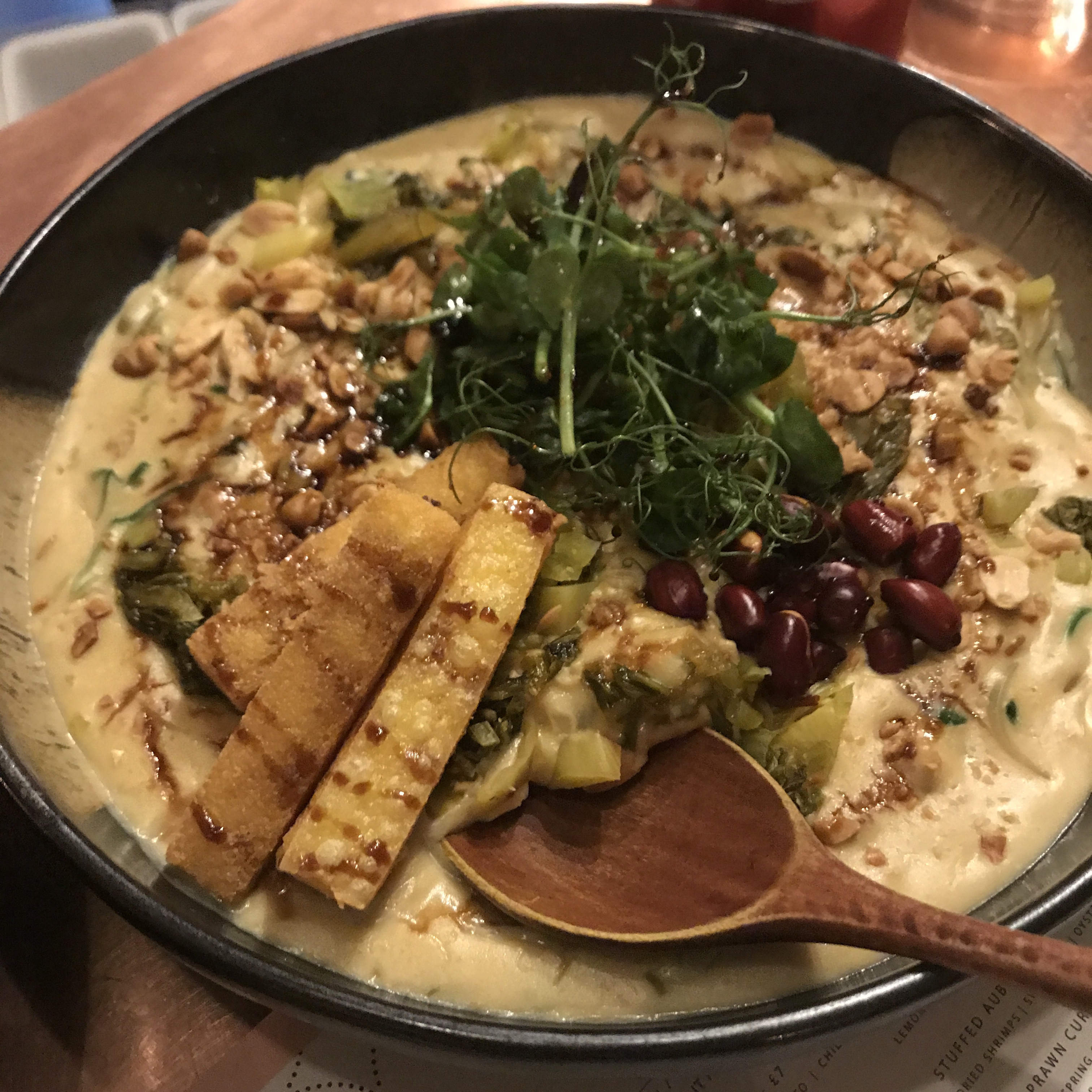 Tofu nway is described on the menu as “silky”, but I would describe it more as “thick and soggy” as the sauce coats the noodles like a kind of thick satay without as strong a flavour. According to my friend, it would typically be flooded with a much thinner soup and topped with lots of fried tofu pieces. The tofu fritter and pickled mustard greens are pretty good, but consumed completely by the beige goo. We fish the noodles and other nibbly bits out and leave most of the “soup”.
