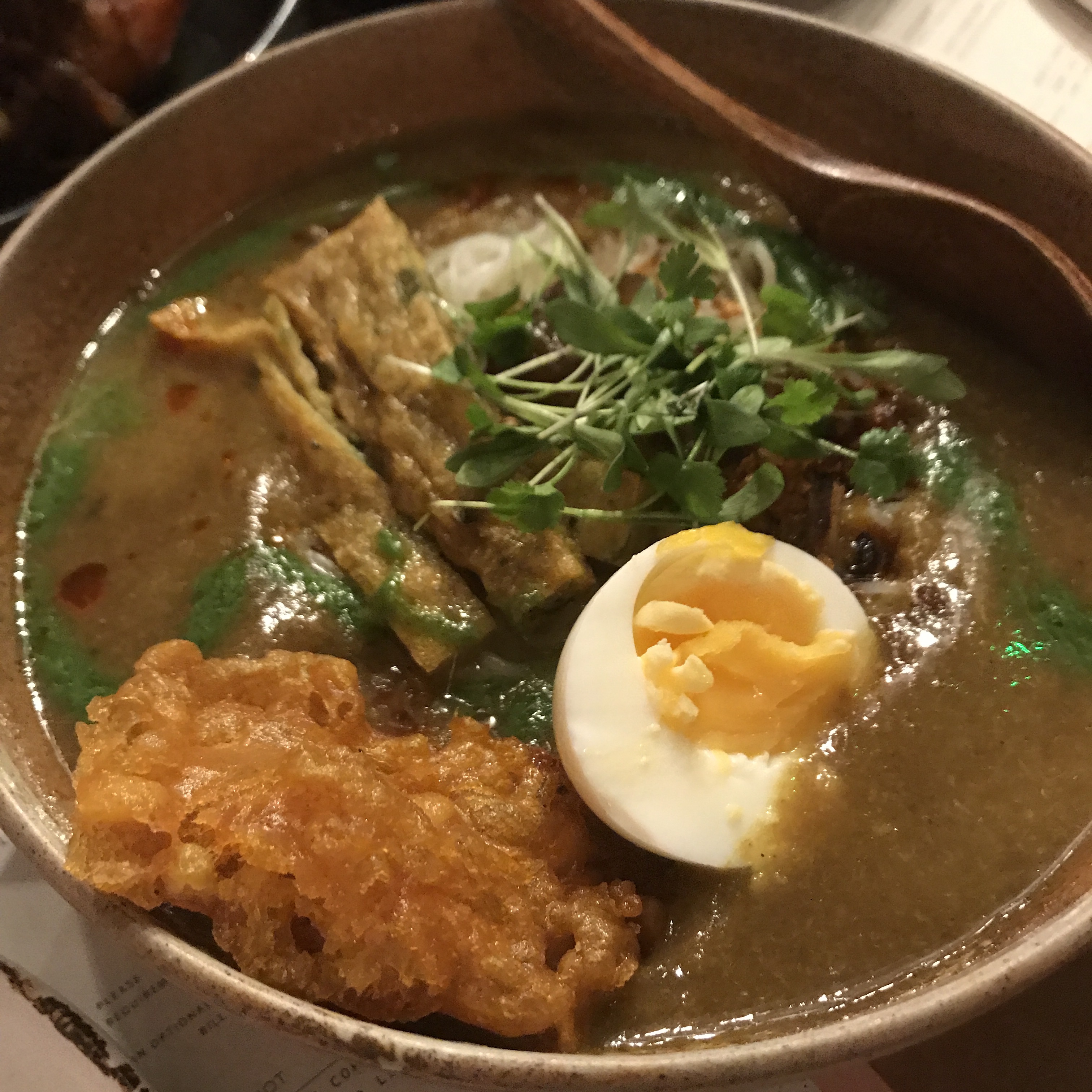 The eponymous dish at Lahpet is Burma’s national delicacy: a colourful mélange of pickled tea leaves, fried beans, peppers, cabbage, tomato, dried shrimp with a shower of toasted sesame seeds. It is eaten at pretty much any time of the day or on any occasion in Burma and is often served deconstructed in a round, compartmentalized dish called an ohk. The pickled tea leaves have quite a curious taste: bitter at first, then savoury and slightly zesty, as the aroma of tea drifts up into the back of my nasal passage – very pleasant with the salt and crunch of the fried vegetables.