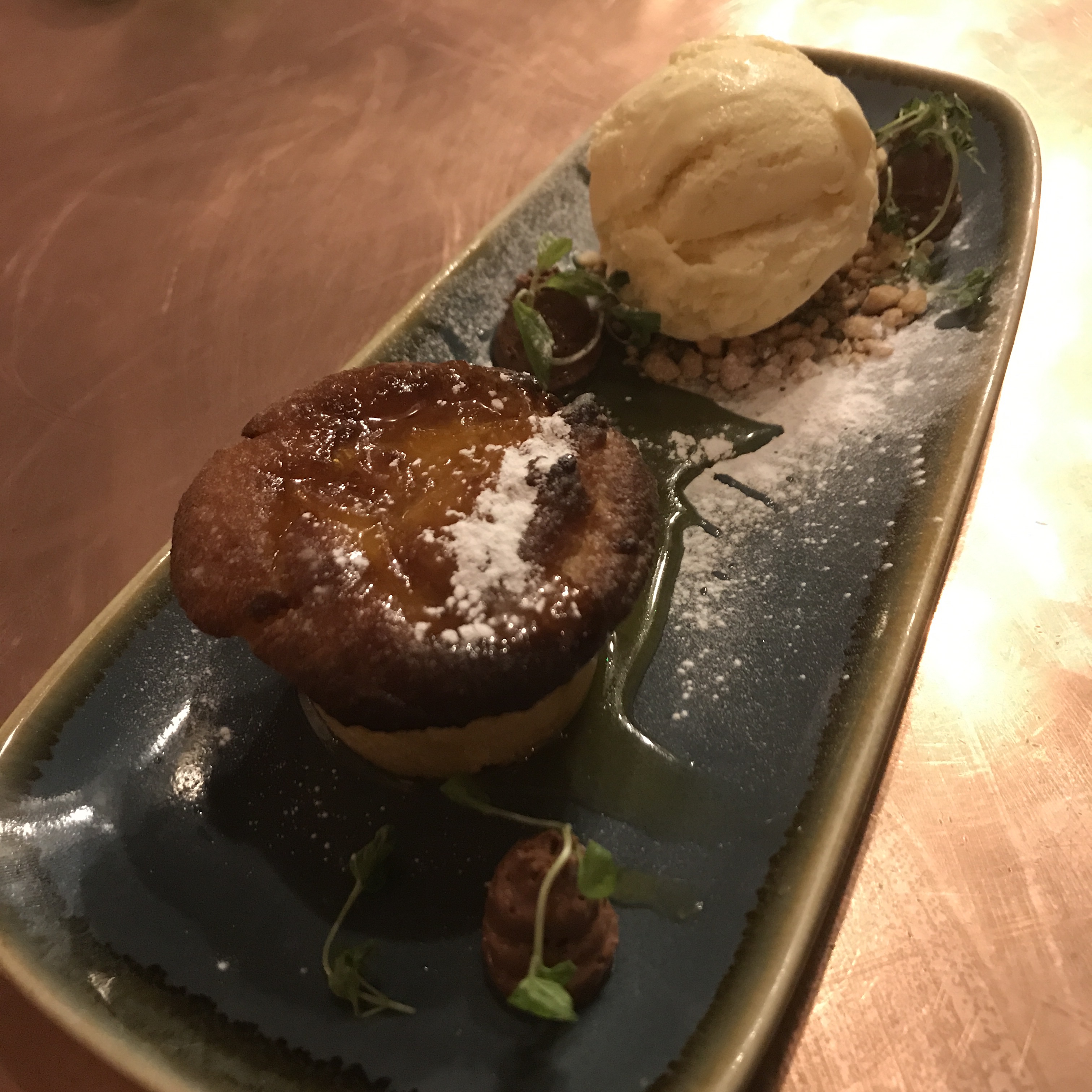 We are so full by this point that we only manage one dessert between us. The orange and semolina cake (sanwin makin) may not be for everyone but I’m a big fan: it is delightfully stodgy and drenched in a citrus syrup with a couple of splodges of whipped chocolate cream. A large boule of orange and pineapple ice cream (I think) sits on top of a tempting pile of jaggery crunch and possibly hazelnuts, which lend some texture to the cake. All of the different components work together and, frankly, the combination of orange, chocolate, pineapple, nuts and sugar is bloody delicious.