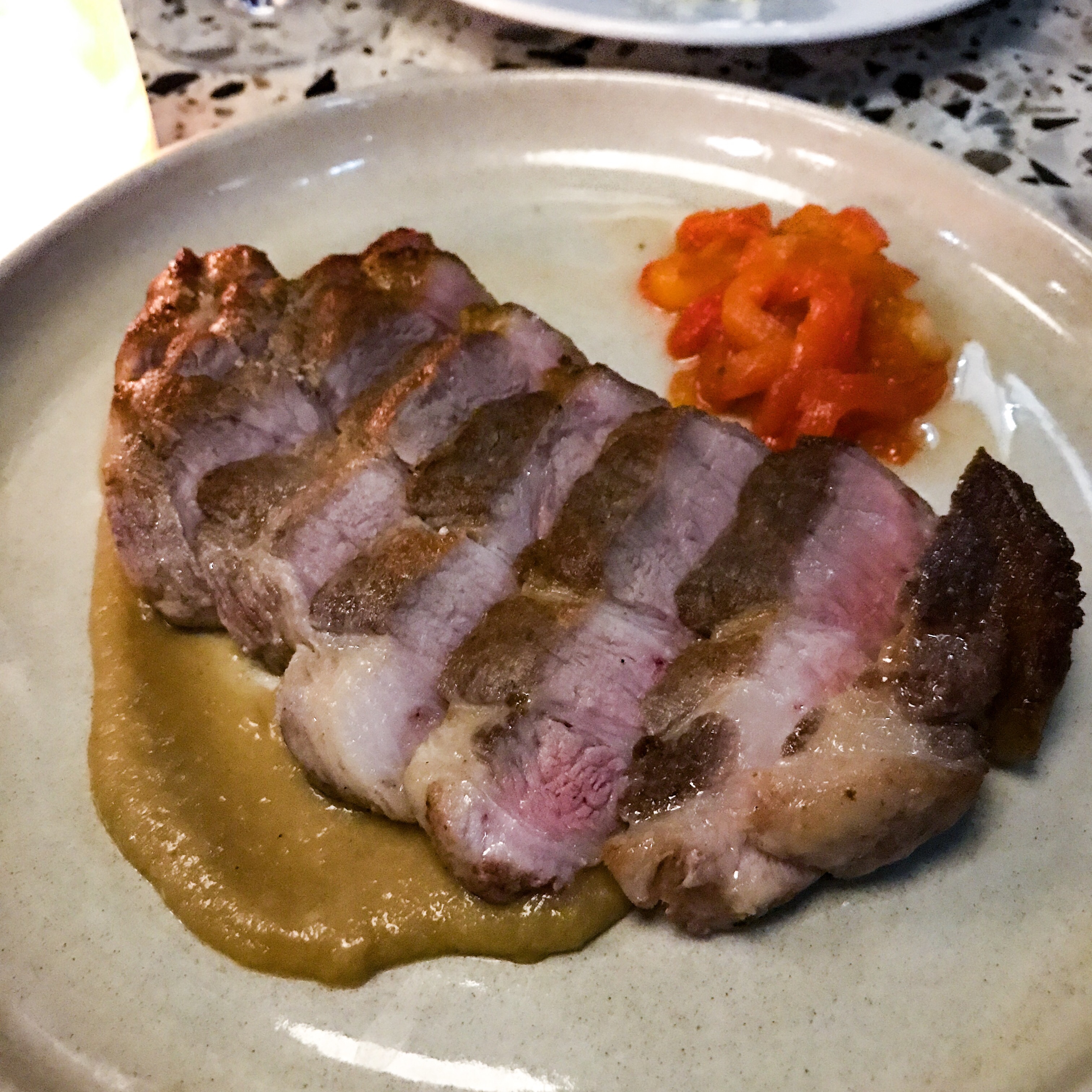Next up is a bowl of hake broth (not photographed, I’m afraid). It’s tomato-based, warm and spicy – everything you want on a cold evening – but the fillet of hake is slightly overcooked. A pork rib-eye comes in hefty slices with a thick grilled crust and tender, marbled middle. The fat has slightly caramelised which is delightful, especially when we dip it in the thick smudge of velouté underneath. The small pile of pickled peppers are so piquant that even Peter Piper might think twice before picking a peck of them – unnecessary for me, but I have a sweet tooth.