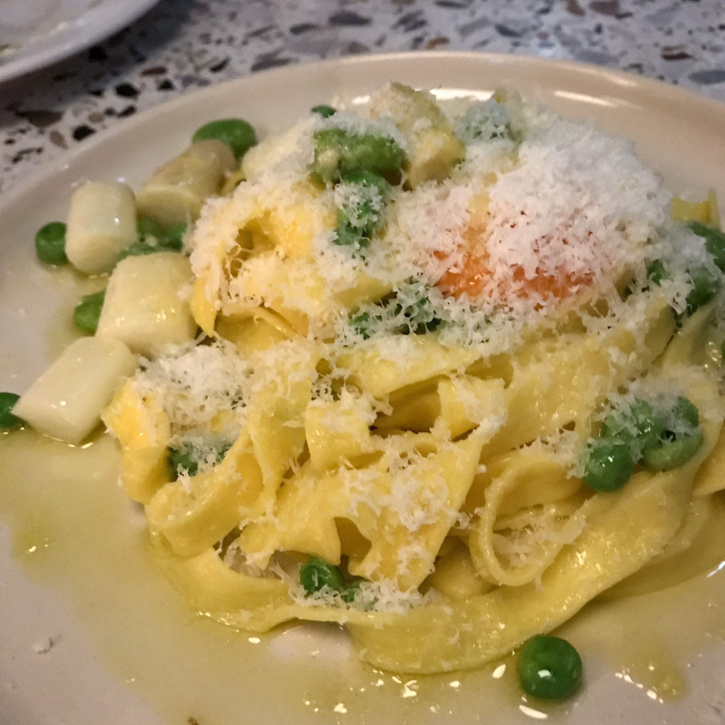 A plate of spring tagliatelle is gorgeous: fresh and colourful, with firm peas, broad beans, a chunky spear of white asparagus and a healthy grating of Parmesan. We pierce the yolk and swirl it through the pasta before munching the lot.