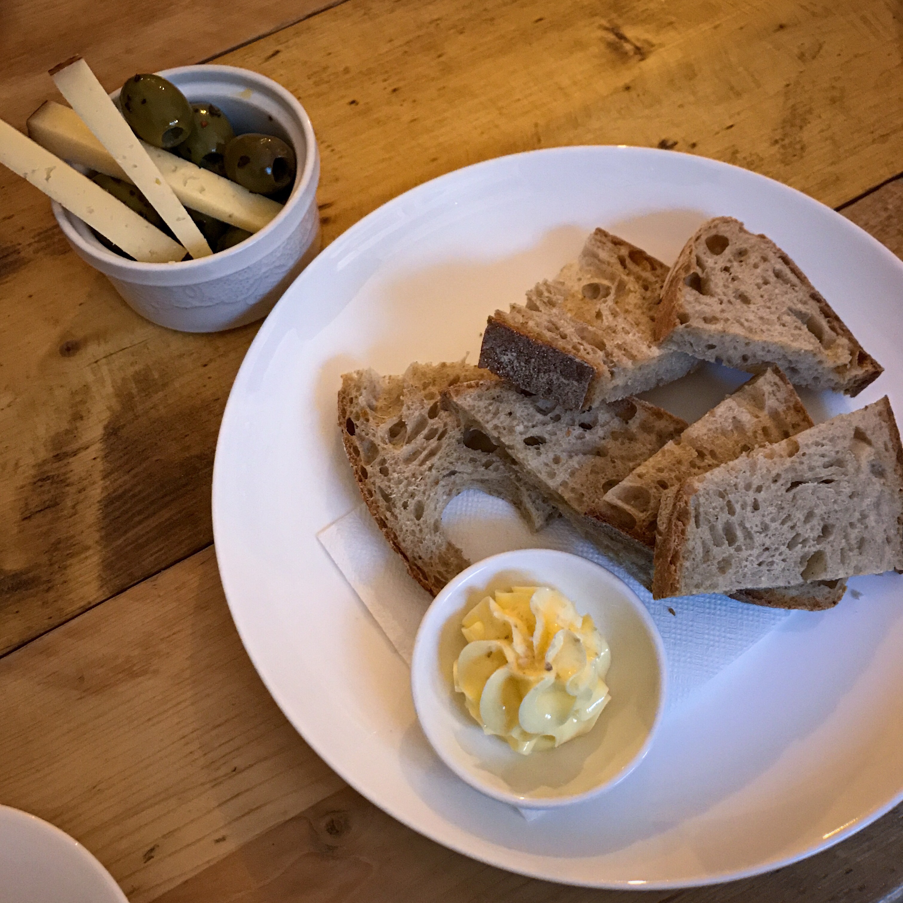 The menu concept is pretty simple: five snacks to nibble at “while you ponder”, then ten other sharing plates and a handful of side dishes. If you’re averse to sharing, simply treat the left-hand side of the menu as starters and the right-hand side as mains. We start with a few irregular-shaped slices of local Morningside sourdough, which come with a starry splodge of soft, smoky butter. A small ramekin of green olives are juicy with a touch of chipotle heat and some salty sticks of Manchego make for good snacking while we try to decide which of the main dishes we’re going to have to give up.