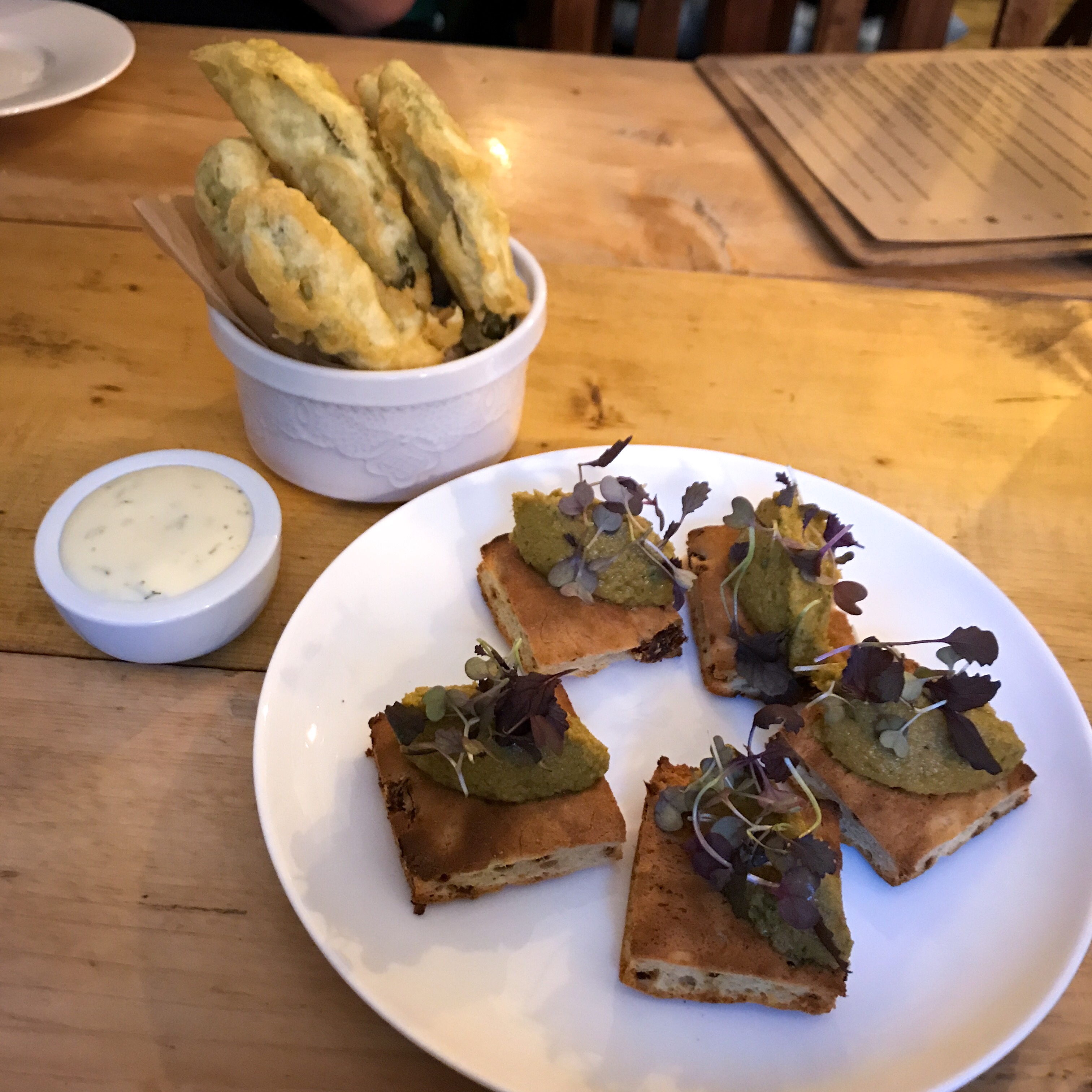 Round two of the snacks brings our collective favourite: another ramekin jammed with “frickles” (fried pickles, for the uninitiated). They use the sweeter variety of pickle, deep-fried in a good Scottish batter and served with a silky aioli, which is thankfully not overpowered by flecks of dill. A cluster of firm flatbread canapés topped with tapenade are quite good, even for an olive-loather like myself.