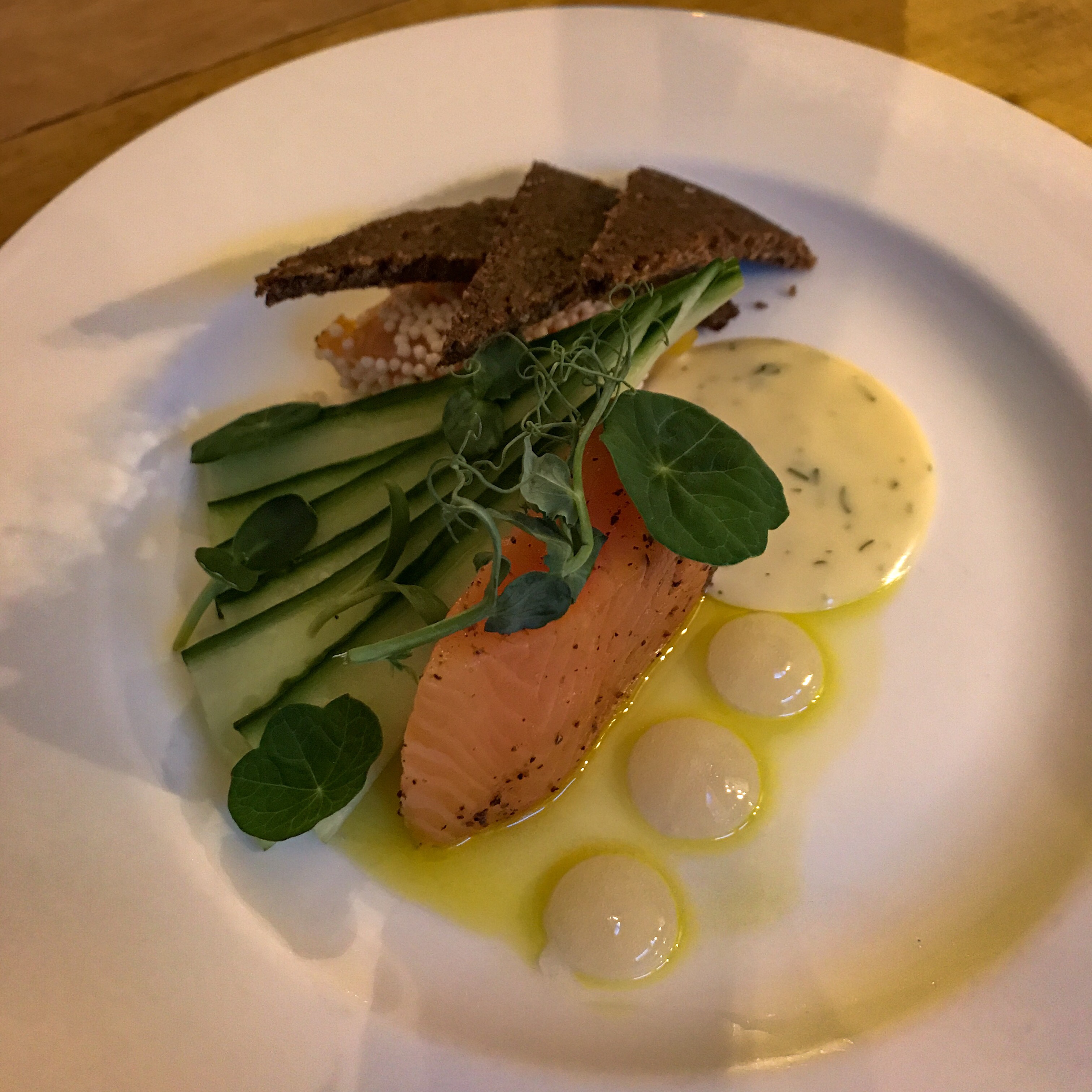 We decide to go big and order seven of the sharing plates between the three of us – only slightly exceeding the recommended dose of two per person. The first is an absolute beauty: two thick wodges of Loch Fyne salmon, delicately cured in gin and cleverly served with a tonic gel. From the first firm but yielding bite, it’s clear this salmon has lived an extraordinarily charmed life and has been treated equally kindly by Aurora’s kitchen. Pumpernickel slices are a bit soggy and a hidden slice of orange is unnecessary, but the dill aioli, cucumber and puffed rice are all excellent accompaniments.