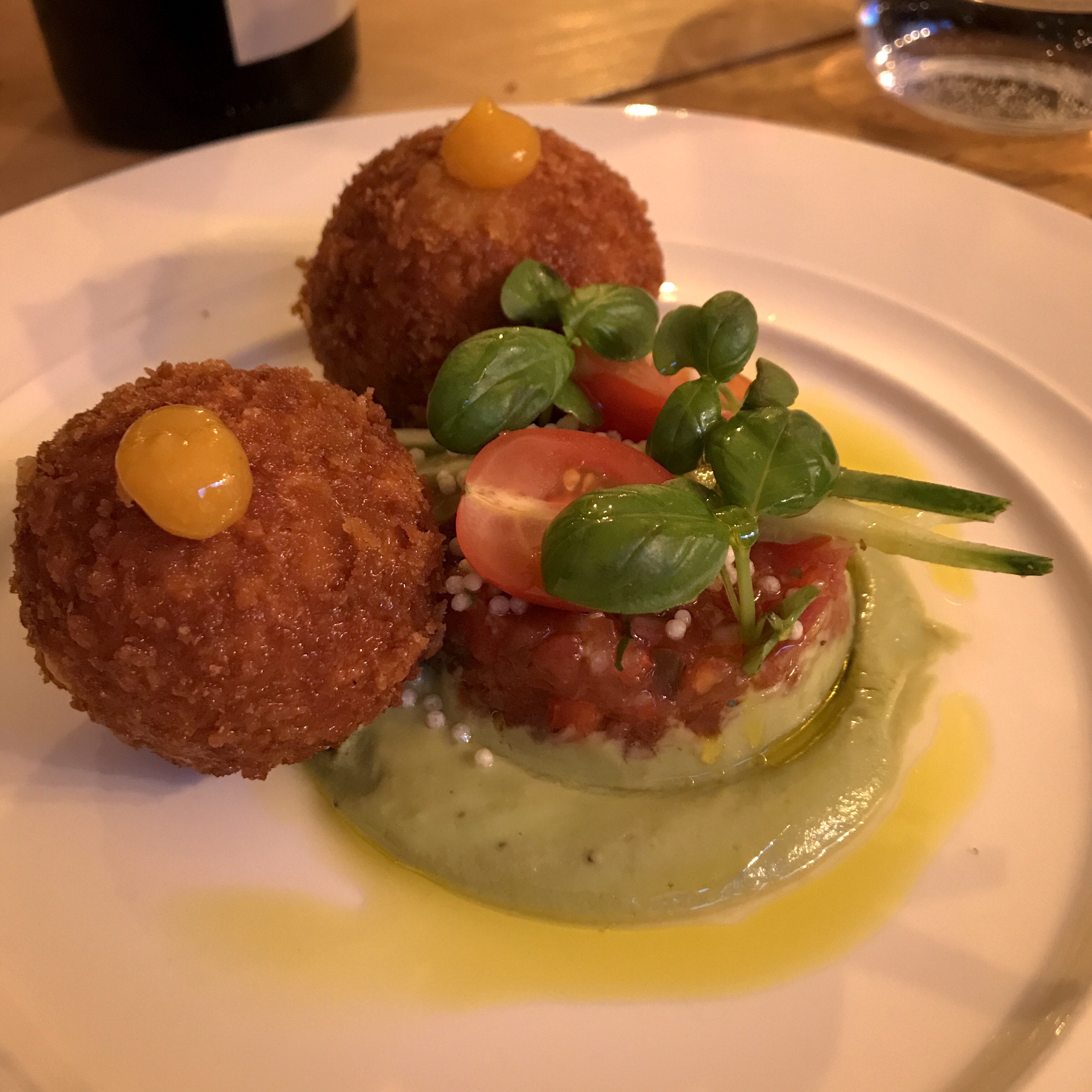 Two arancini the size of tennis balls are formidably crispy and stuffed with a lightly zesty courgette risotto. The combination of rich avocado crème fraîche and fresh pico de gallo is dreamy and we happily scrape up spoonfuls into the arancini.