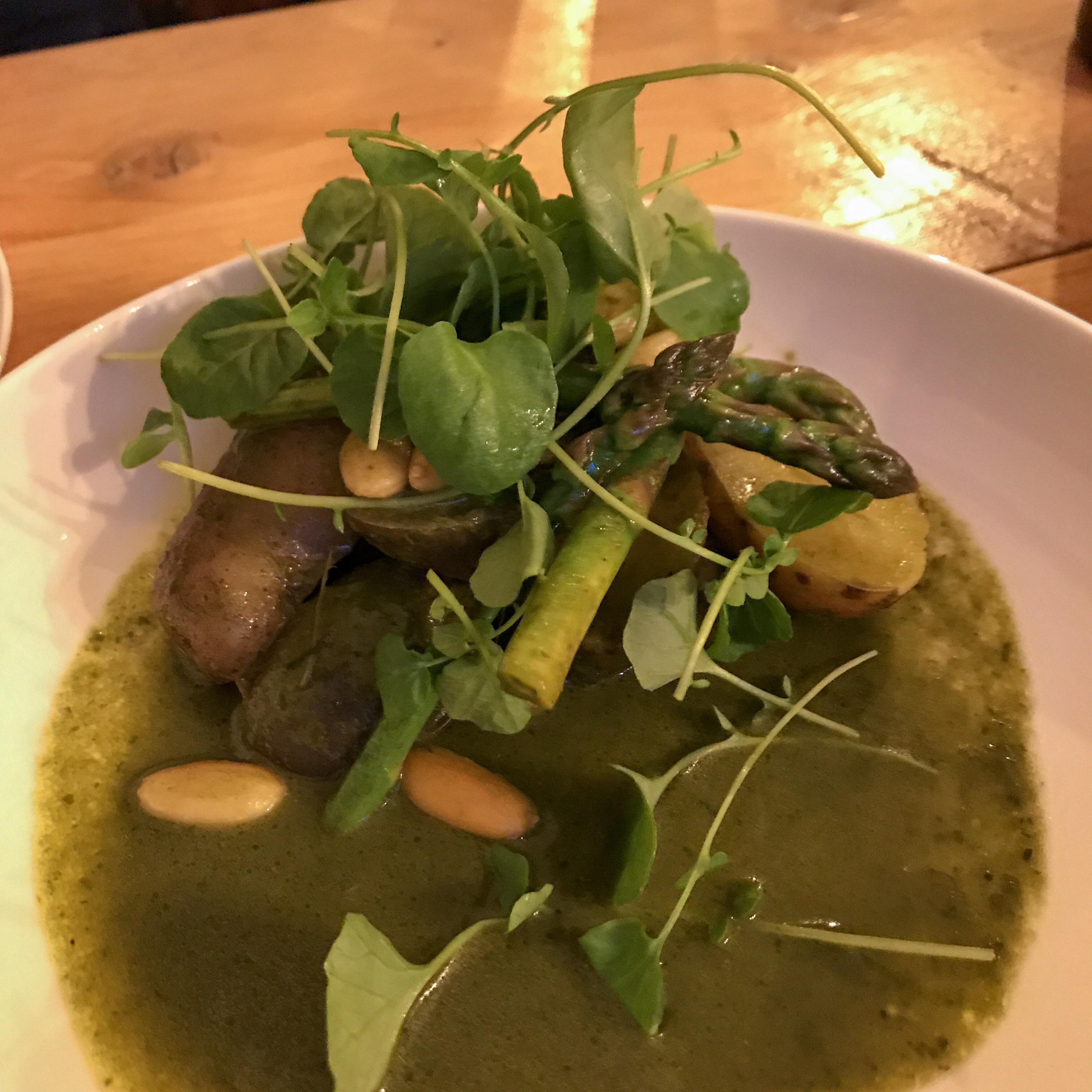 A pile of heritage potatoes is one of the less pleasing dishes of the evening. The green sauce is a little bland, which is strange considering it contains both Marmite and watercress – two very distinctive flavours. Slivers of asparagus and scattered whole almonds have a rubbery texture, which detracts from the actually very pleasant texture of the different potato varietals. In hindsight, the side of campfire potatoes with dill and brown butter that wafted past our table might have been a safer choice.