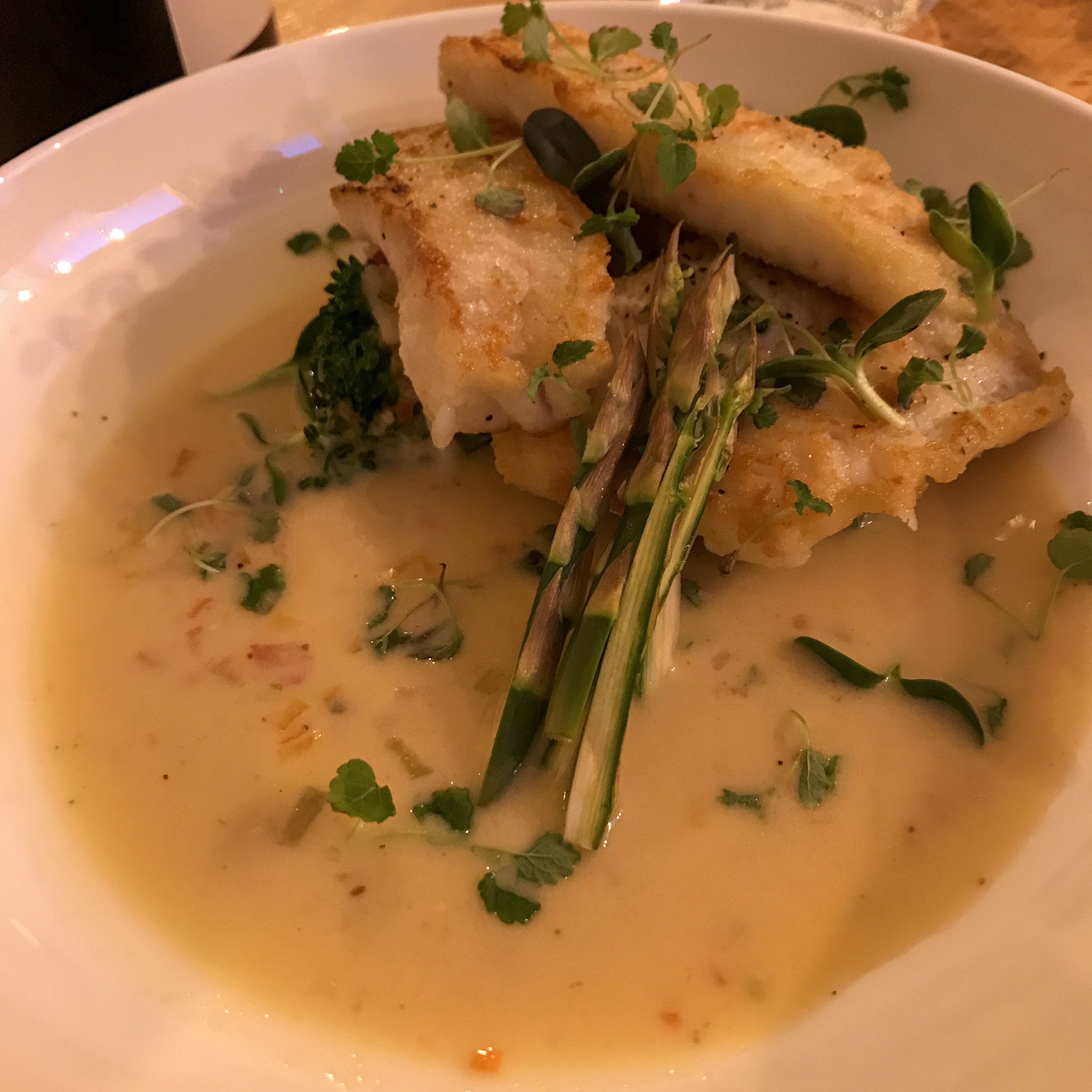 As dinner goes on, we notice that there are a couple of recurring ingredients – the dabs of apricot gel, the tiny kernels of puffed rice, the asparagus cooked three different ways. Some may think it repetitive or unimaginative, but in fact it creates a subconscious thread through the dishes that (like The Dude’s rug) really ties the menu together.