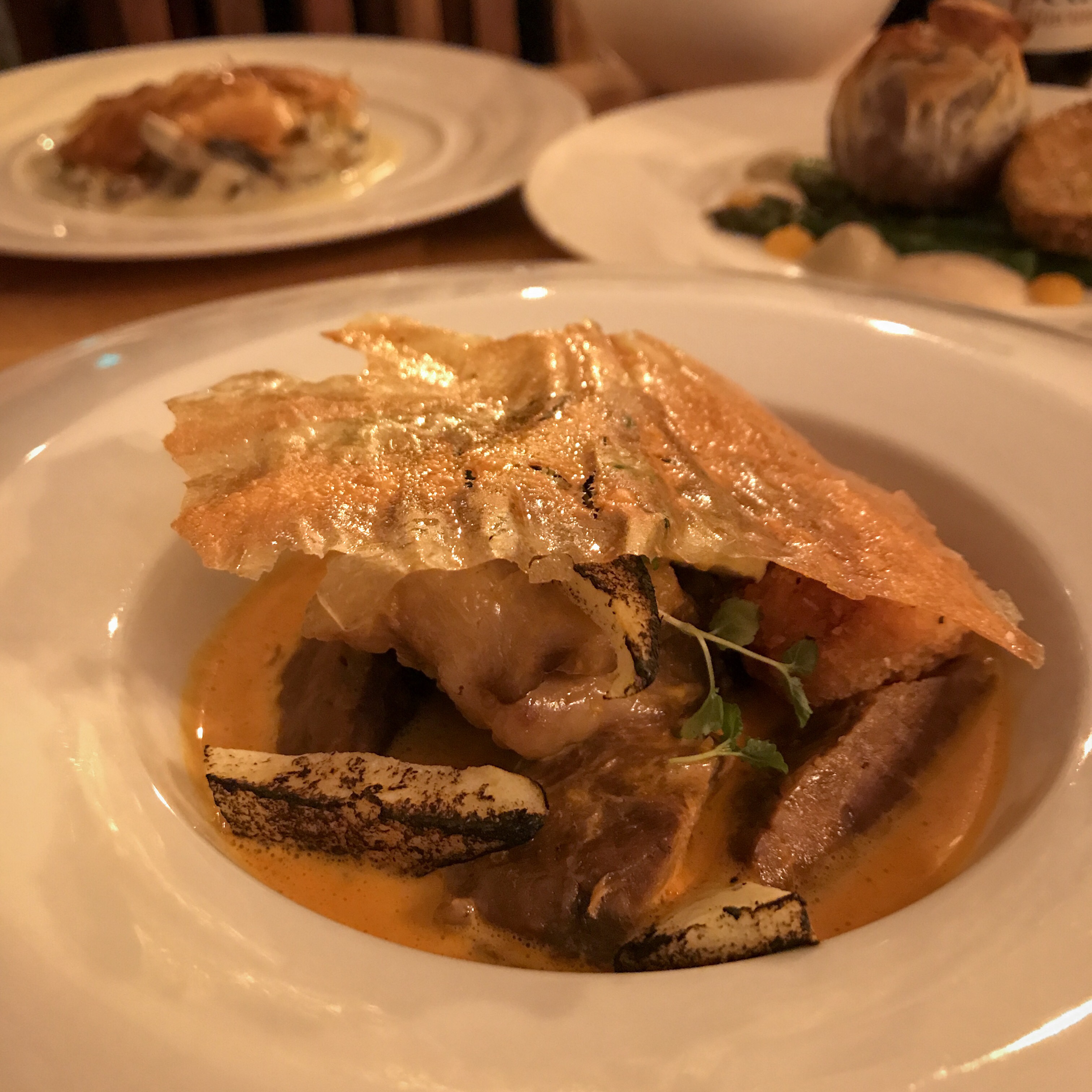 Pork cheeks are irresistible on pretty much any menu and Aurora is no exception, especially with the added temptation of lobster bisque (swoon) and scampi (double swoon) completing the surf ‘n’ turf vibe. A couple of thick, triangular slices of burnt apple take the edge off the rich braised meat and a delicate sheet of potato glass (made by mashing and dehydrating a thin layer of potato and carrot) adds a novel crispy twist.