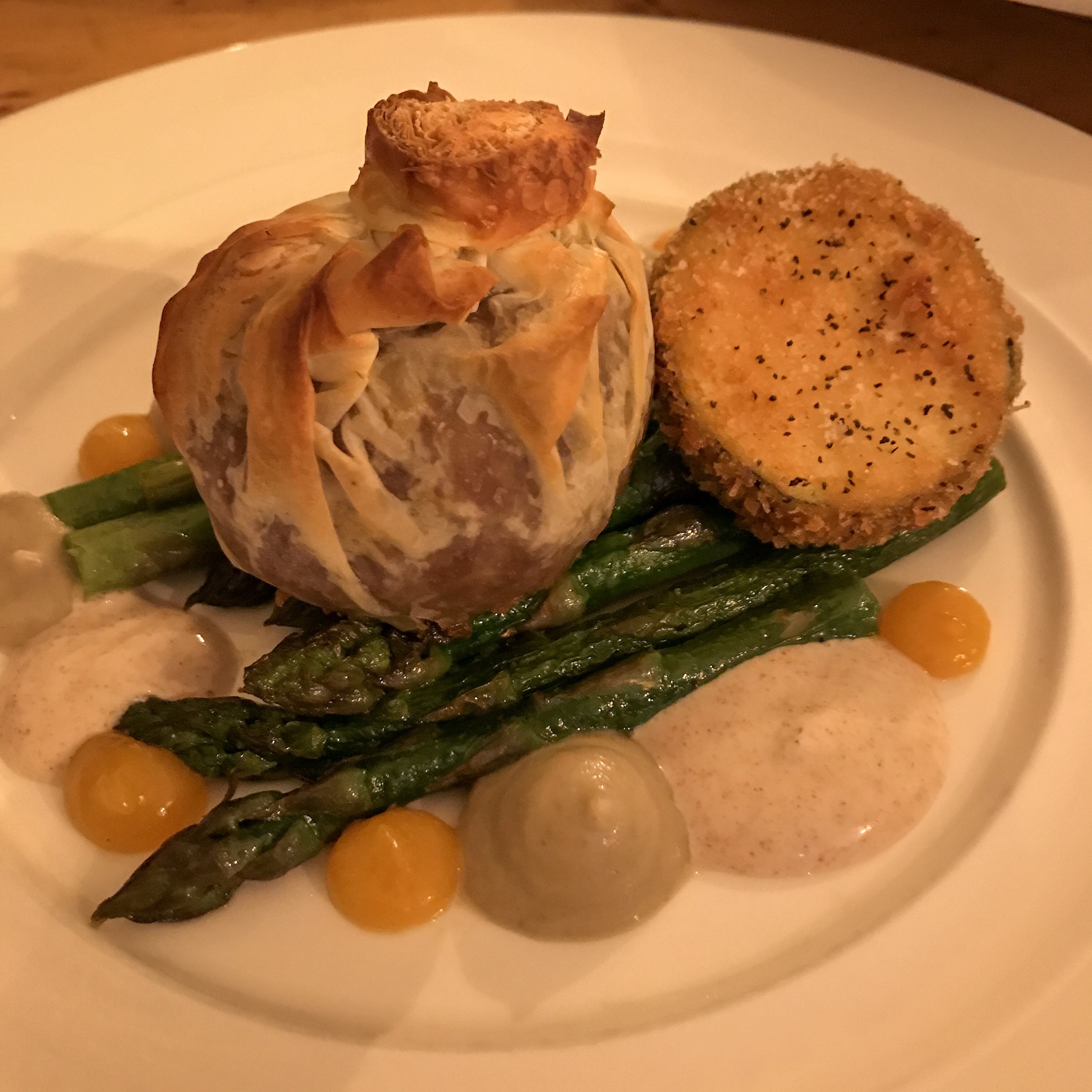 A dense pastilla of duck (confited in-house twice a week) is, again, a stand-out dish. The spherical shape is different to the traditional flat Moroccan pie, but allows the dish to dramatically burst open, releasing the unmistakeable aromas of fennel seed, allspice and cinnamon. Babaganoush and labneh mixed with chermoula (a North African sauce of garlic, coriander, cumin, oil, lemon juice and salt) make for very saucy bedfellows and the apricot gel and asparagus continue the theme.