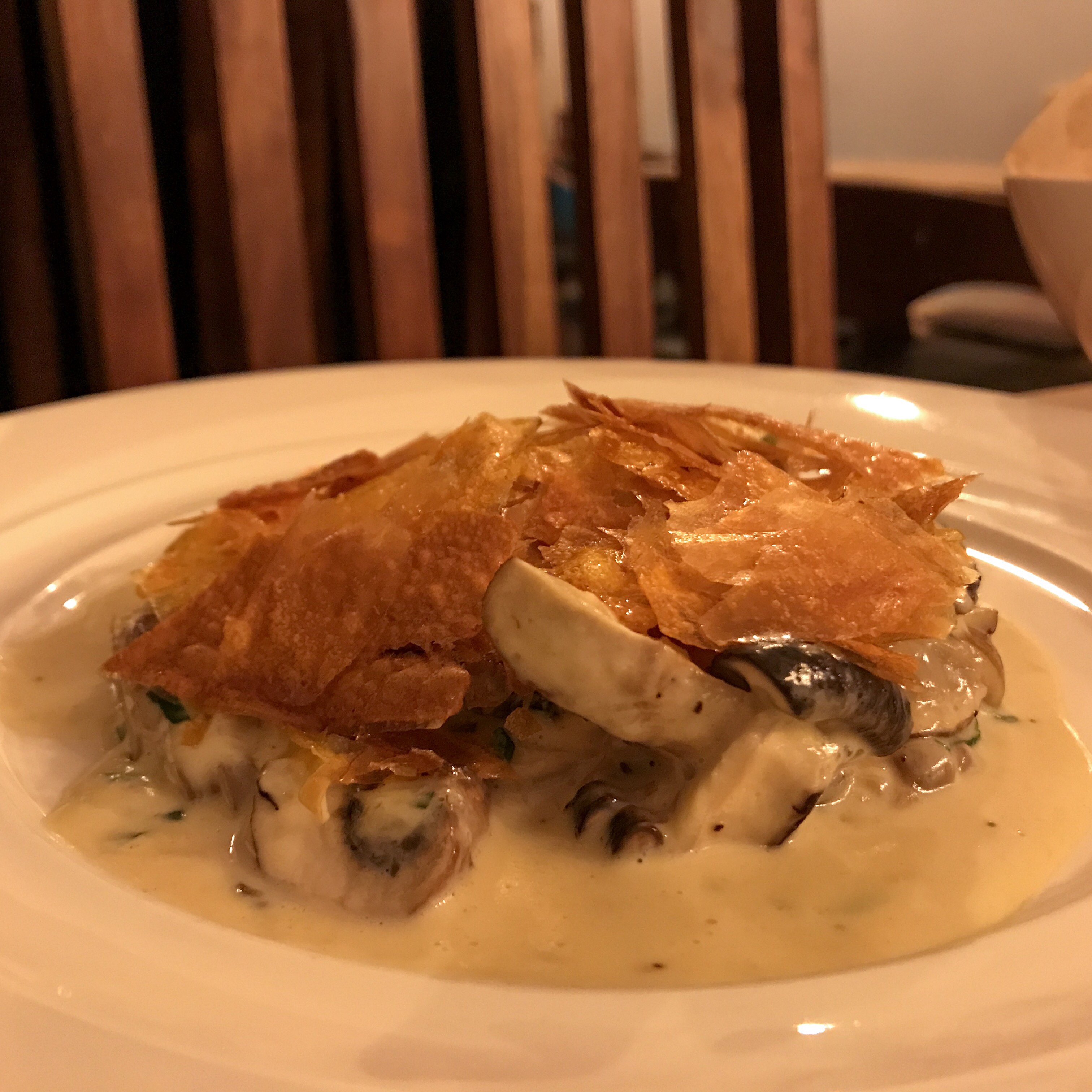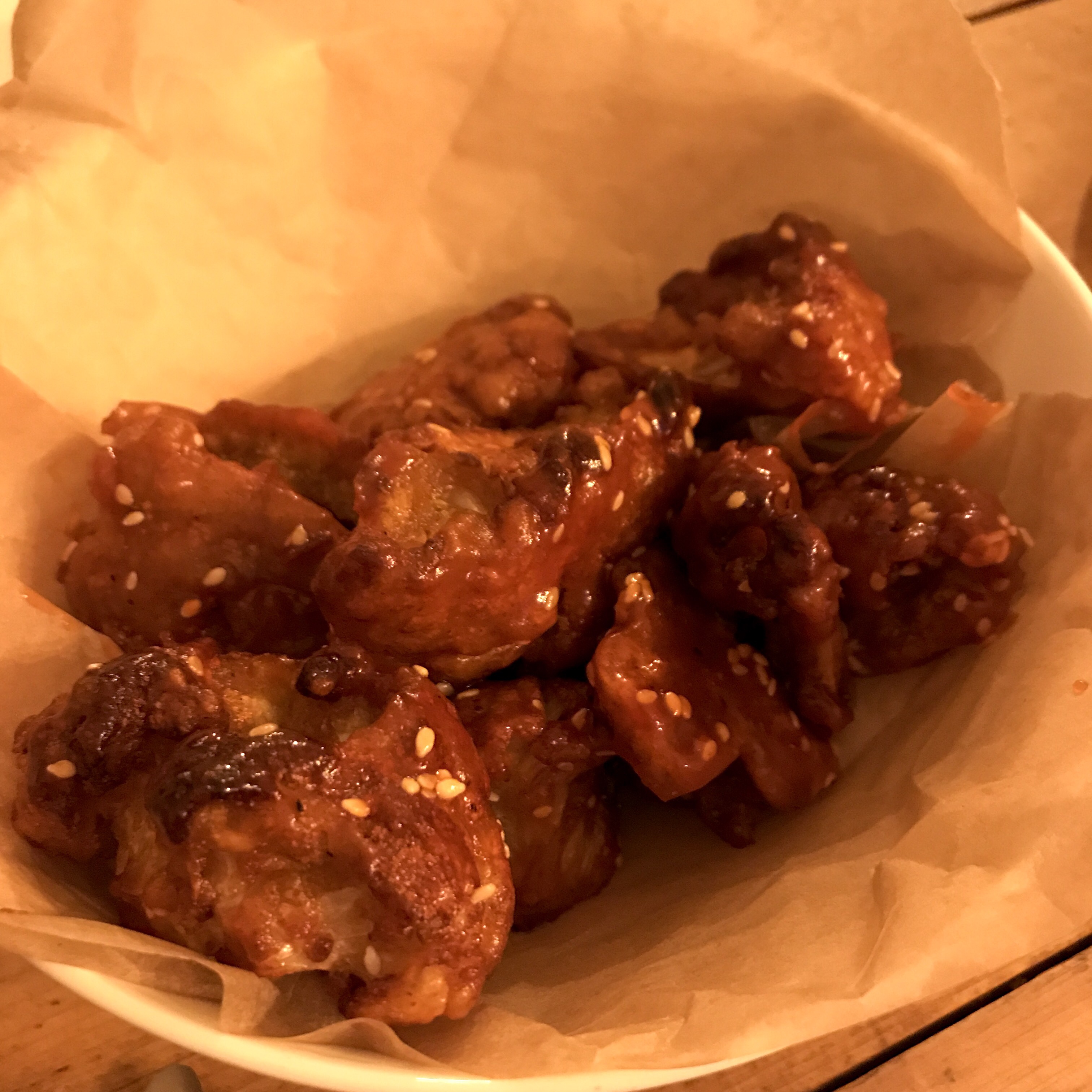 A plate of fat mushroom slices comes doused in slick cheese and covered with shards of the same potato glass, though I am too preoccupied with the pork cheeks to really dig into it. A basket of sticky sriracha grilled cauliflower scattered with sesame seeds makes for an excellent final side.
