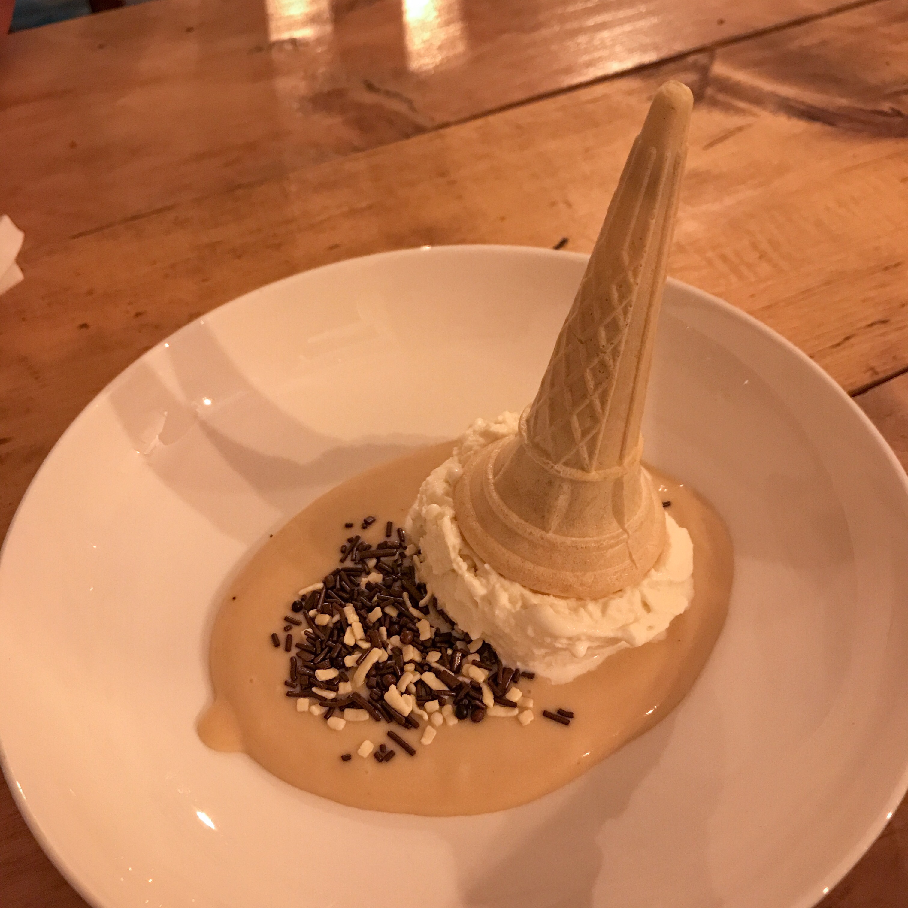 By the time we reach dessert, we are all completely stuffed. The miso caramel crème anglaise to share (and a couple of complimentary drams of Japanese plum wine) is all we can manage. Fortunately it is spectacular: a beautifully thick puddle of caramelised salty-sweet miso custard, comically garnished with an upside-down vanilla ice cream cone and some chocolate sprinkles.