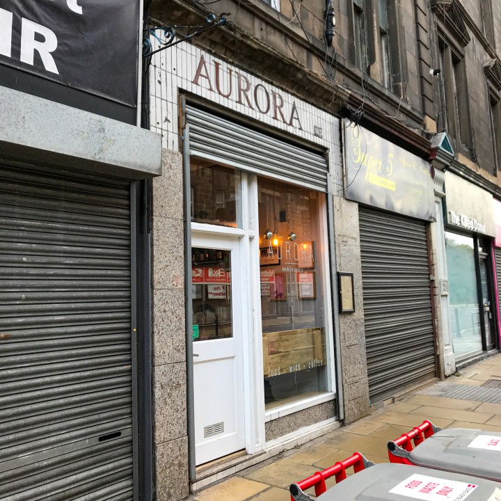 From the outside, Aurora (187 Great Junction Street, Leith) looks like it may have been a launderette or tanning salon in its past life. Metal shutters creep down over its inconspicuous windowfront, which bears the delightfully vague yet enticing words “modern eatery”. On the inside, the space is truly diminutive (maybe 24 covers) but warm and welcoming – reclaimed wooden tables and benches give it a Scandi vibe and the steamed-up windows let you forget you’re dining on probably one of the less desirable streets in Leith. Nautical sort of lighting hints at the historical shorefront a few hundred yards away where, along with numerous others, two of Scotland’s finest chefs ply their Michelin-starred trade – The Kitchin and Restaurant Martin Wishart.