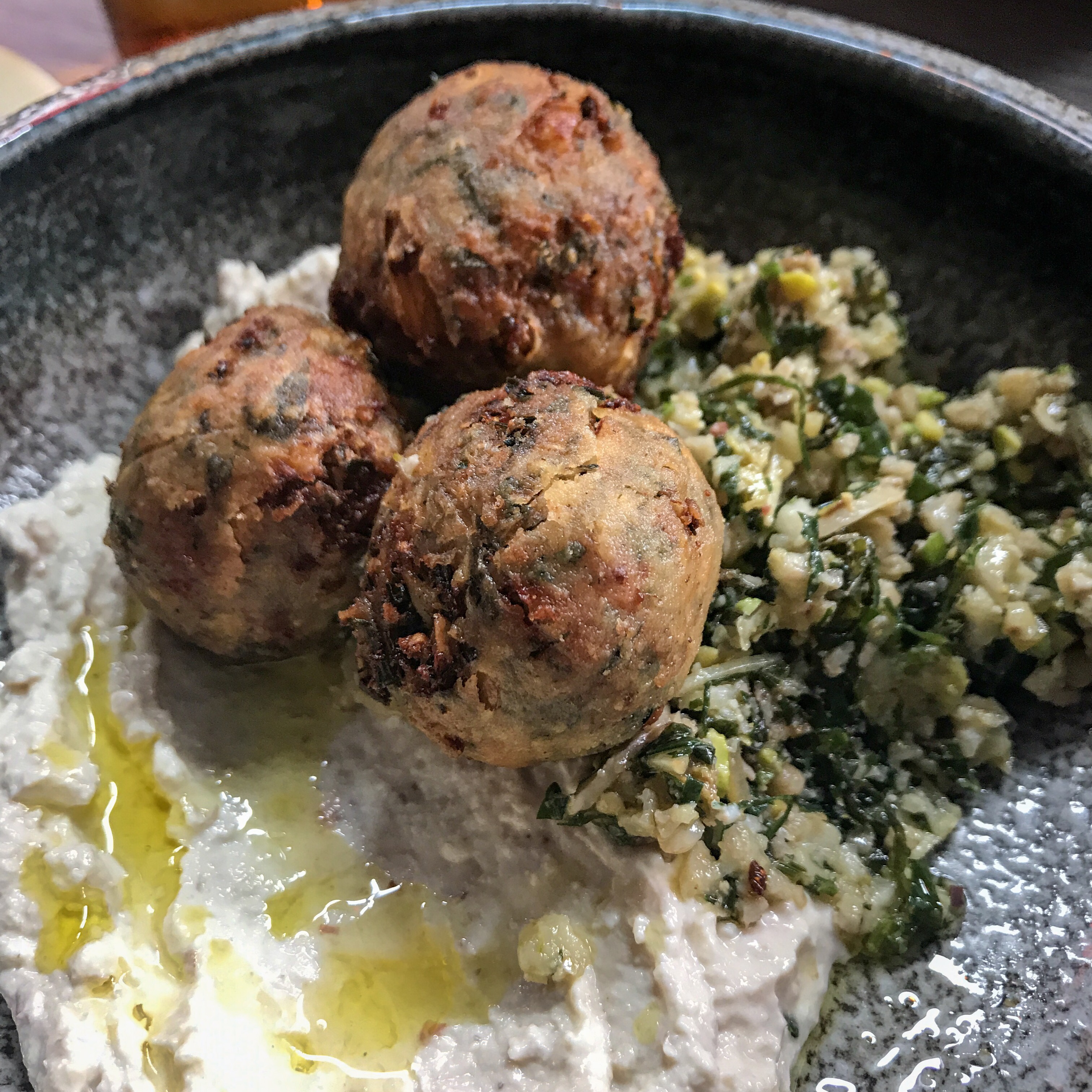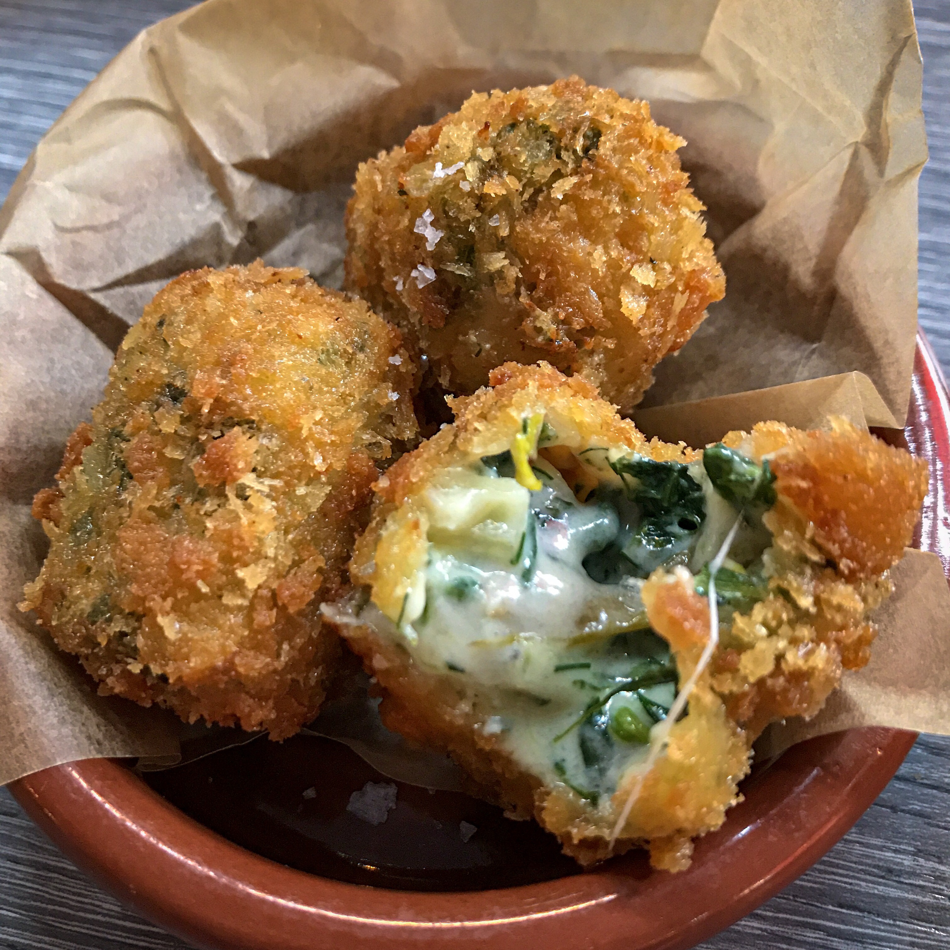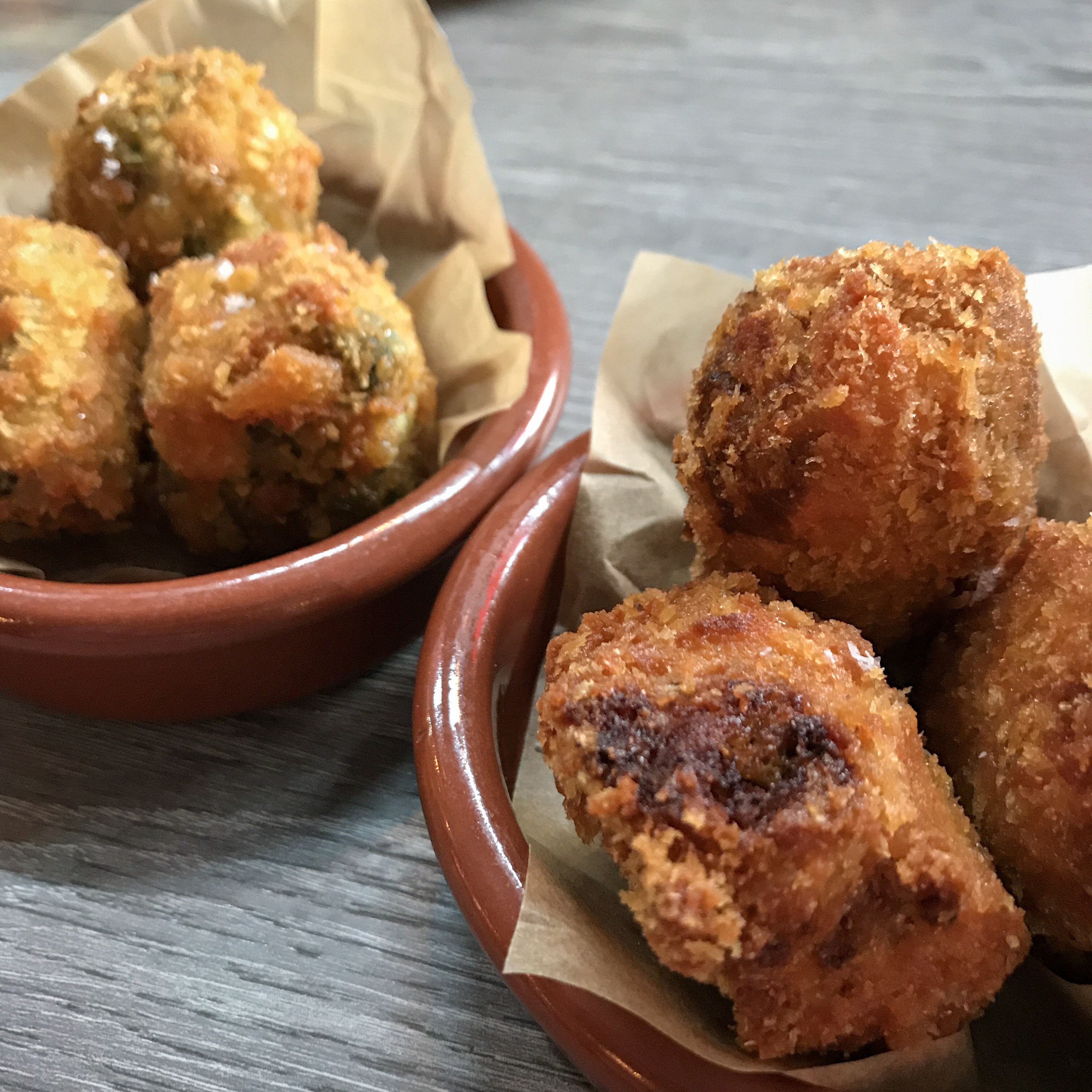 Wild greens mac ‘n’ cheese bites are simply divine. I mean, just look at them… all seductive in their little salty bread coats. The innards are rich and smooth, not at all claggy, and lightly seasoned with dill, which is the perfect partner for the wild greens (or horta, as they’re known in Greek). They’re so good that we immediately order a second plate.