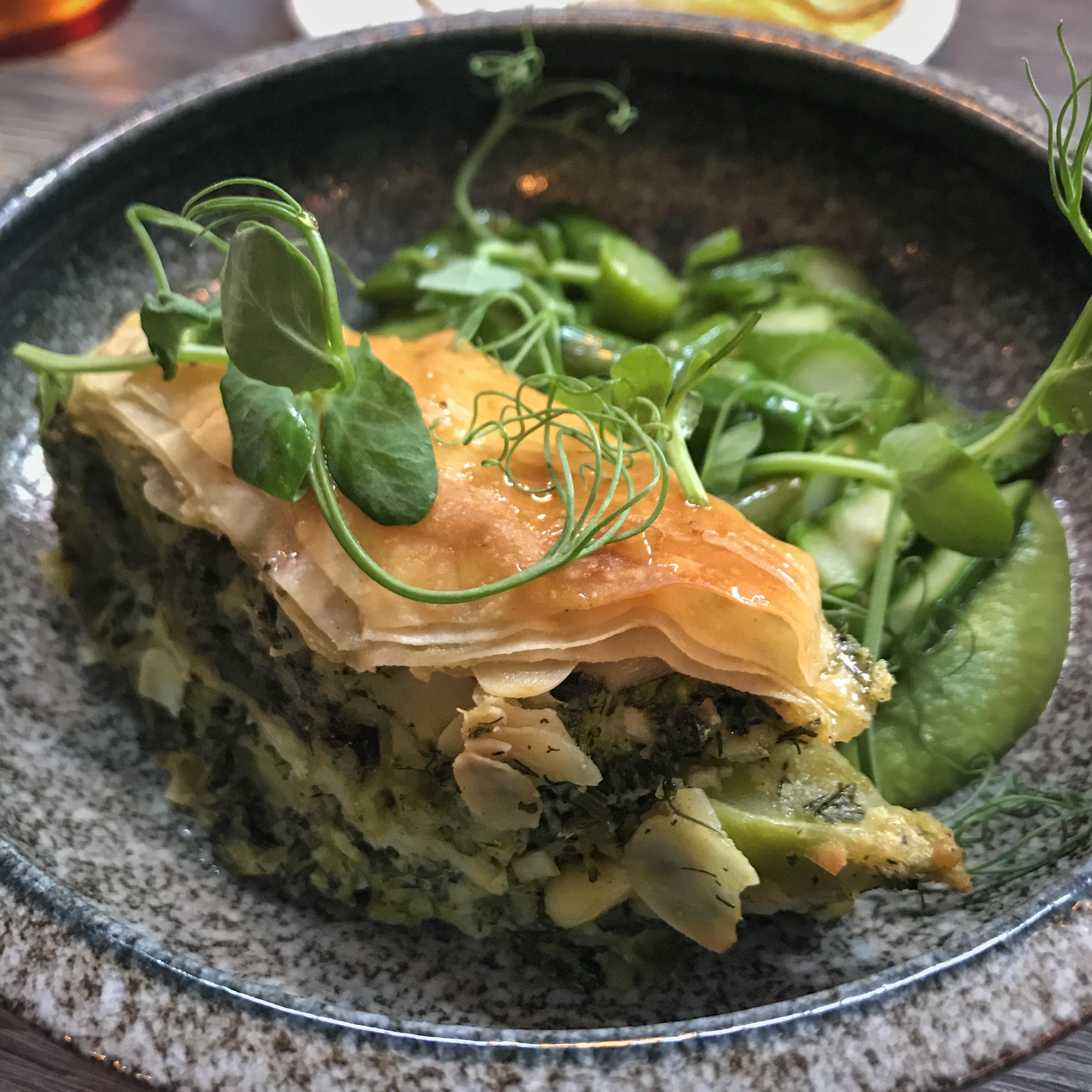 A thick diamond-shaped slice of broccoli baklava is a rather smart idea – each flaky layer interspersed with dill, sliced almonds and little flecks of feta. A luscious bed of green pea skordalia (potato and garlic purée) is good slathering material.