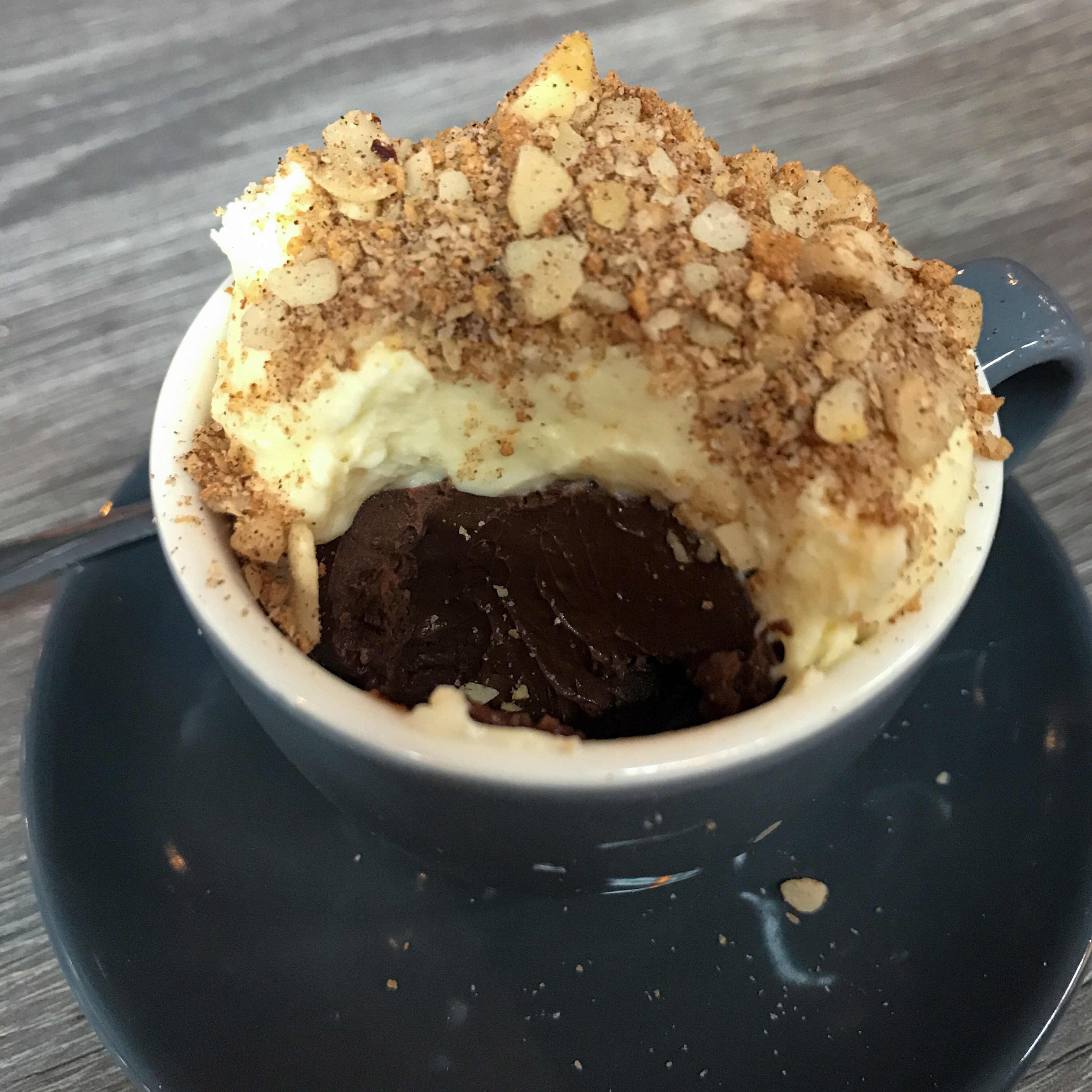 And finally, dessert… Oh my. A gorgeous and slightly alcoholic (I think) chocolate pot, topped with velvety, cloud-like white chocolate cream and a scattering of crushed macadamias and almonds. The perfect end to one of the best lunches I’ve had in ages.