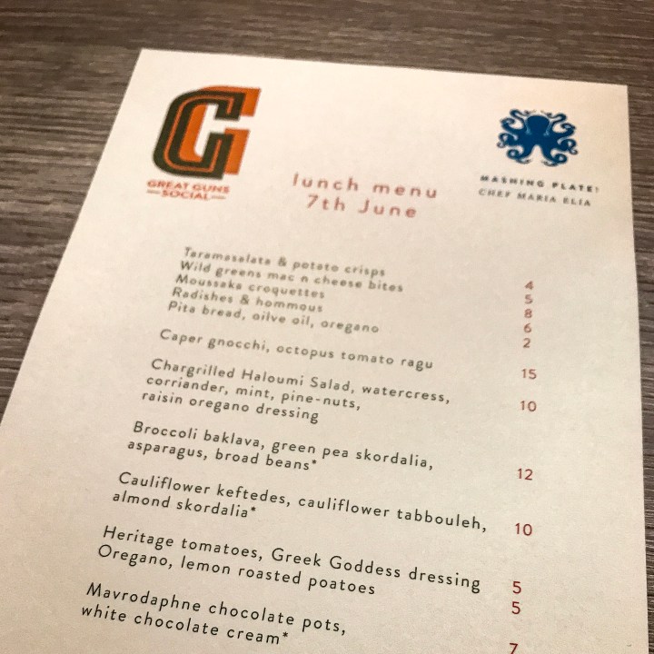 It’s always refreshing then to be invited by a friend to somewhere that I’ve never heard of. The only thing I know in advance is that it’s Greek food, which (as I’ve mentioned before) I am naturally suspicious of inside Zone 2. Great Guns Social is a converted pub in Borough (currently backing onto an unfortunately dusty building site), which describes itself as the “new culinary jewel in the crown of Borough”. Fighting talk.