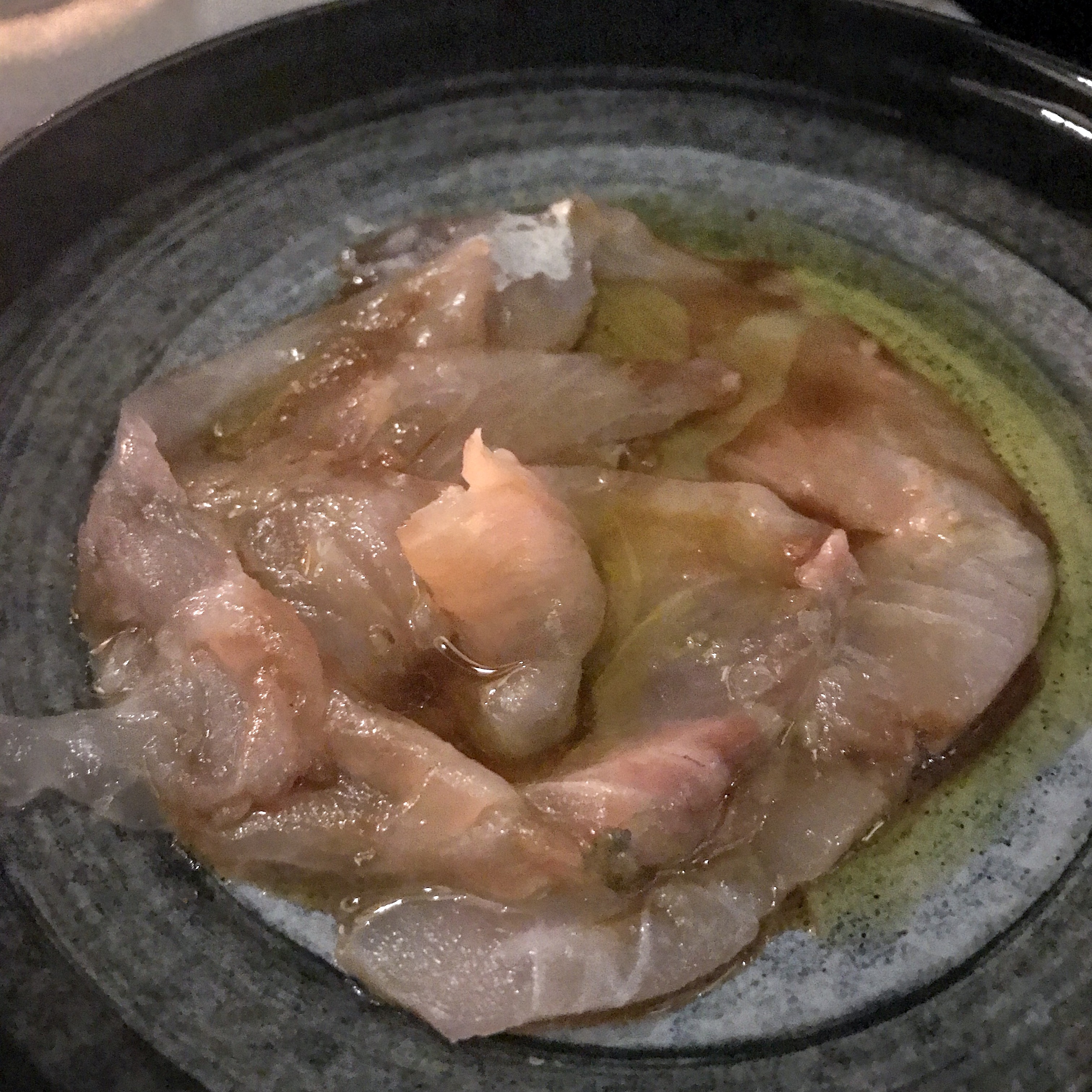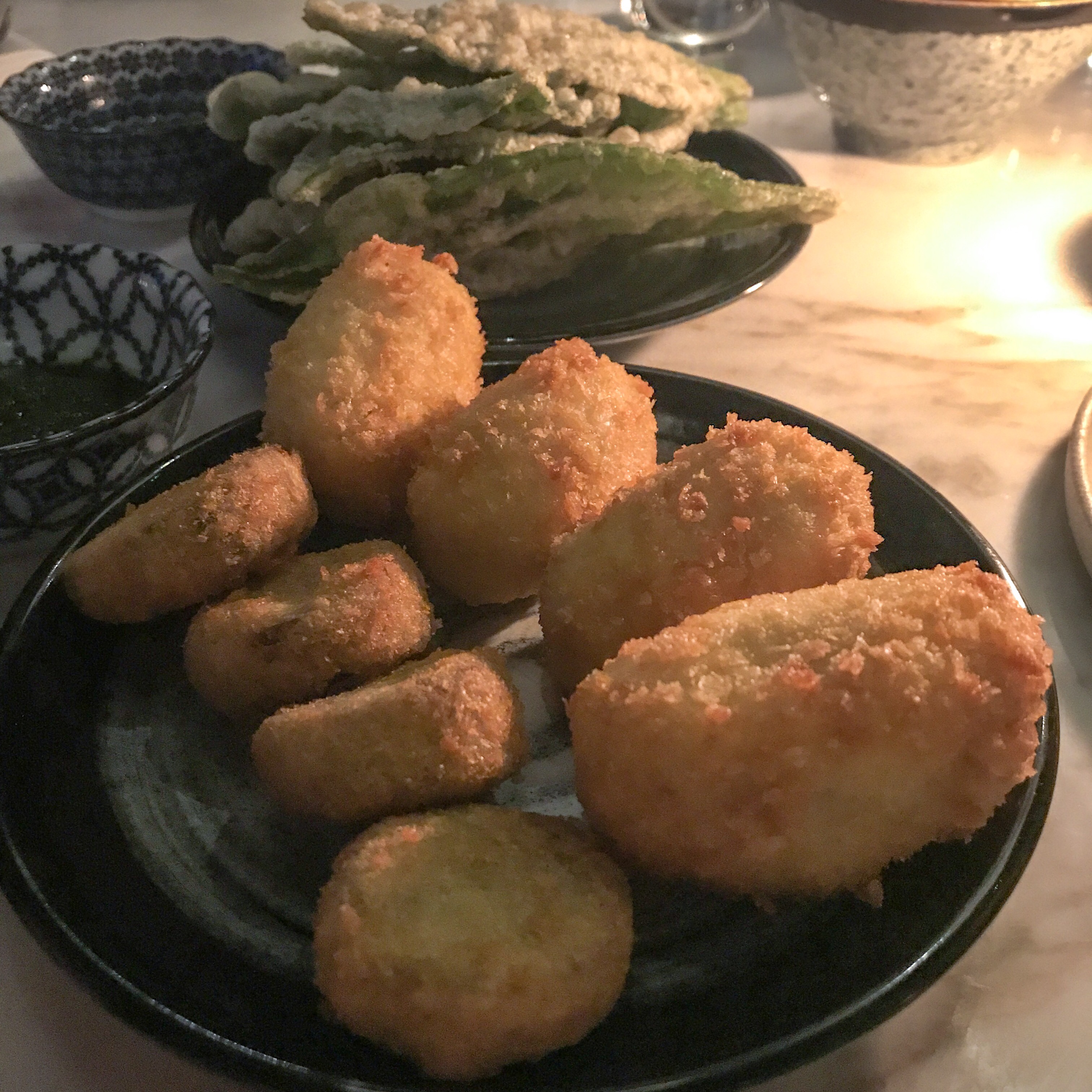 The first couple of courses arrive together, each dish twinned with its own specific condiment or dipping sauce. Fat, fresh tempura borage leaves, each the size of a small child, come in a great pile with a light soy and mirin. Dense duck croquettes and salty unagi arancini are accompanied by slick salsa verde and a thick tonkatsu that walks the line between barbecue and Worcestershire sauce. Sea bass crudo is firm and sinewy and tender raw scallop, served with rice powder, thyme oil and its own dried, grated roe is particularly luscious. As for their homemade focaccia, I would very much like to take a nap on it.