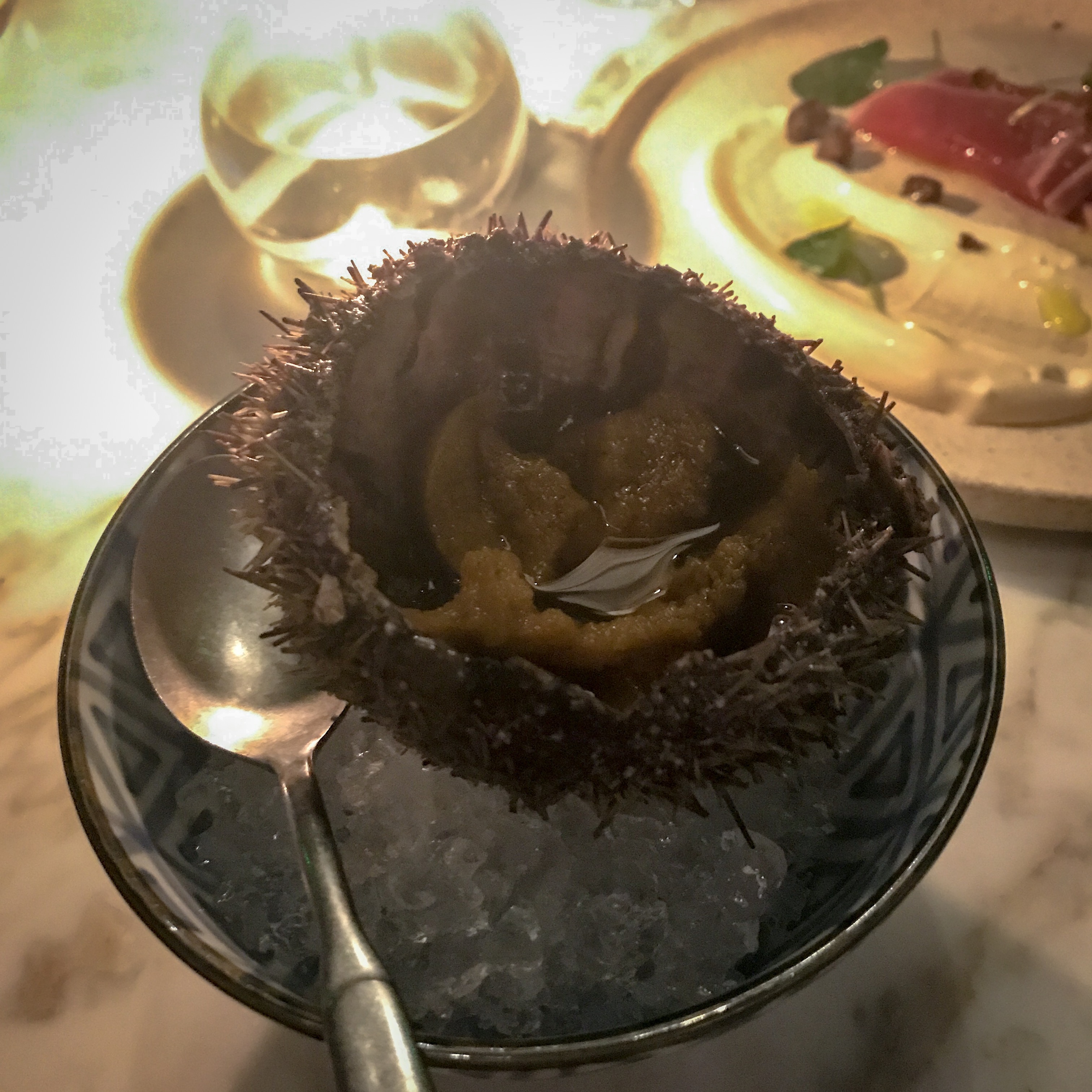 Munching away on gonads (the only edible part of a sea urchin) isn’t exactly my idea of a fun day out with the kids so I tend to avoid uni, but my friend raves about it. The two of us order the £5 supplement, which comes in-shell with a dash of aged soy and yuzu. His is delicate and creamy, reminiscent of a kind of marine foie gras; mine is slightly briney and gritty, reminiscent of an unexpected mouthful of beach.
