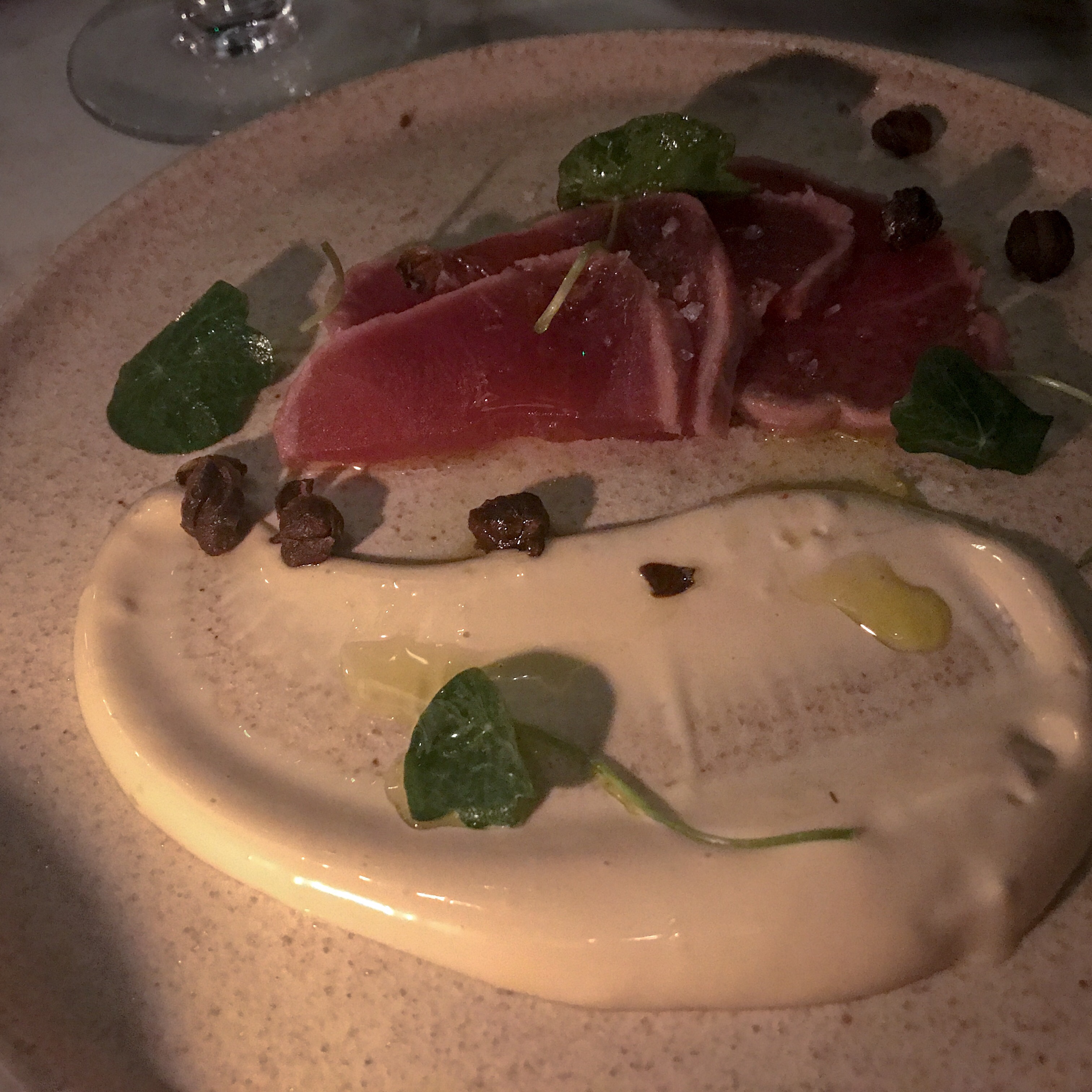 So far so good, but then Angelina goes and steals my heart. Vitello tonnato is an Italian “classic” consisting of cold, sliced veal with a creamy tuna sauce and tart capers. Personally I find it about as appealing as a plate of cold sick (with tart capers) and would never normally order it. It’s like a recipe you would find in an old Victorian cookbook that would need Heston’s golden touch before it even came close to edible. (Sorry, Italy – I love you really.) However, Angelina takes this classic and turns it completely inside out to create something unique: tonno vitellato. Gently seared slices of tuna, still warm from the grill, with a swish of puréed veal mayonnaise sauce and, best of all, those pesky capers, deep-fried to crispy, almost nutty perfection. It’s a sublimely clever idea: creative, original and perfectly executed. If you’re going to do fusion, why not do it like this?