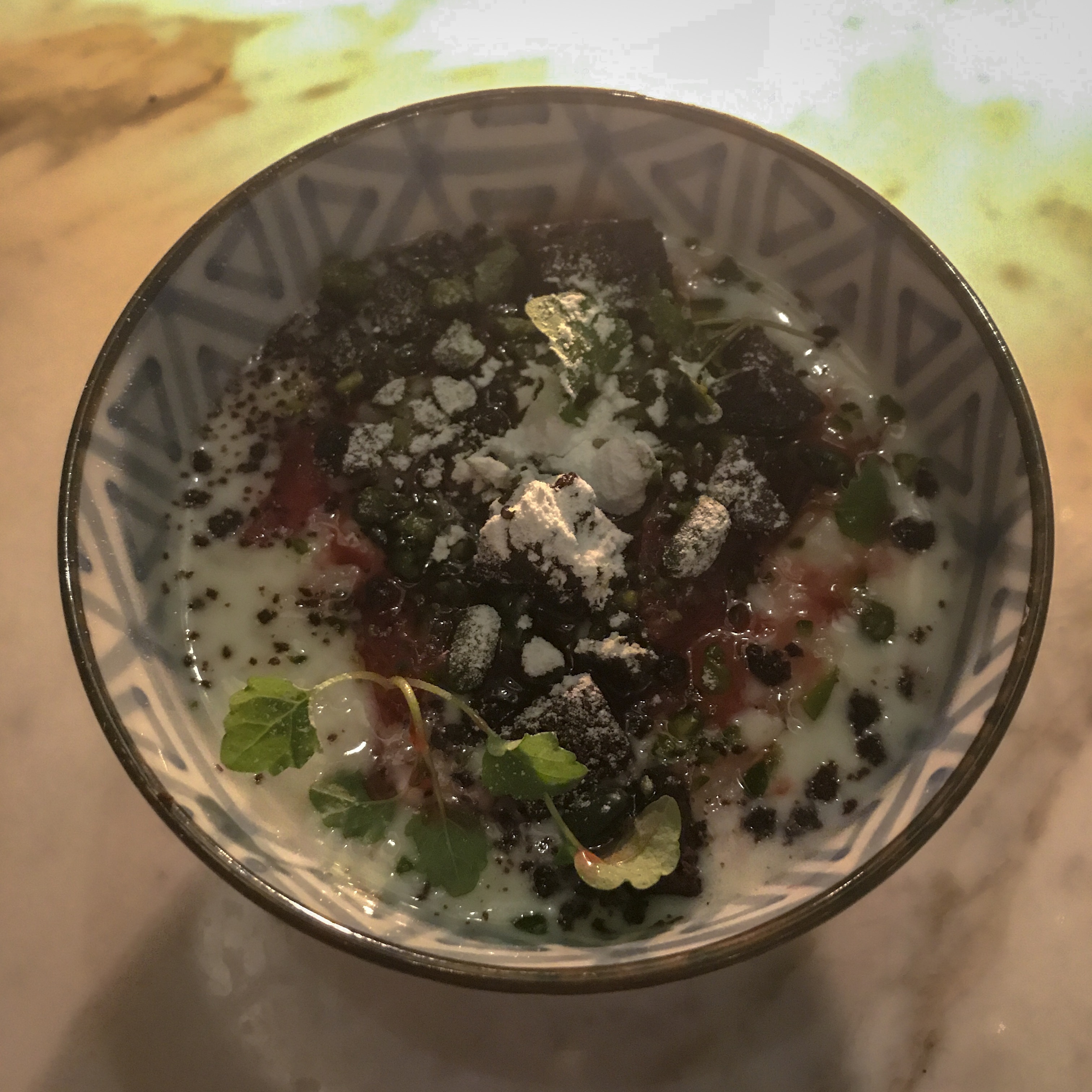 Dessert, however, more than makes up for it: a delicious rice pudding made from a premium type of Japanese rice called yumenishiki. It’s similar to Greek rizogalo (which I haven’t had for years), with bittersweet blood orange compote and a scattering of Levantine pistachios and chocolate nibs adding crunch and texture.